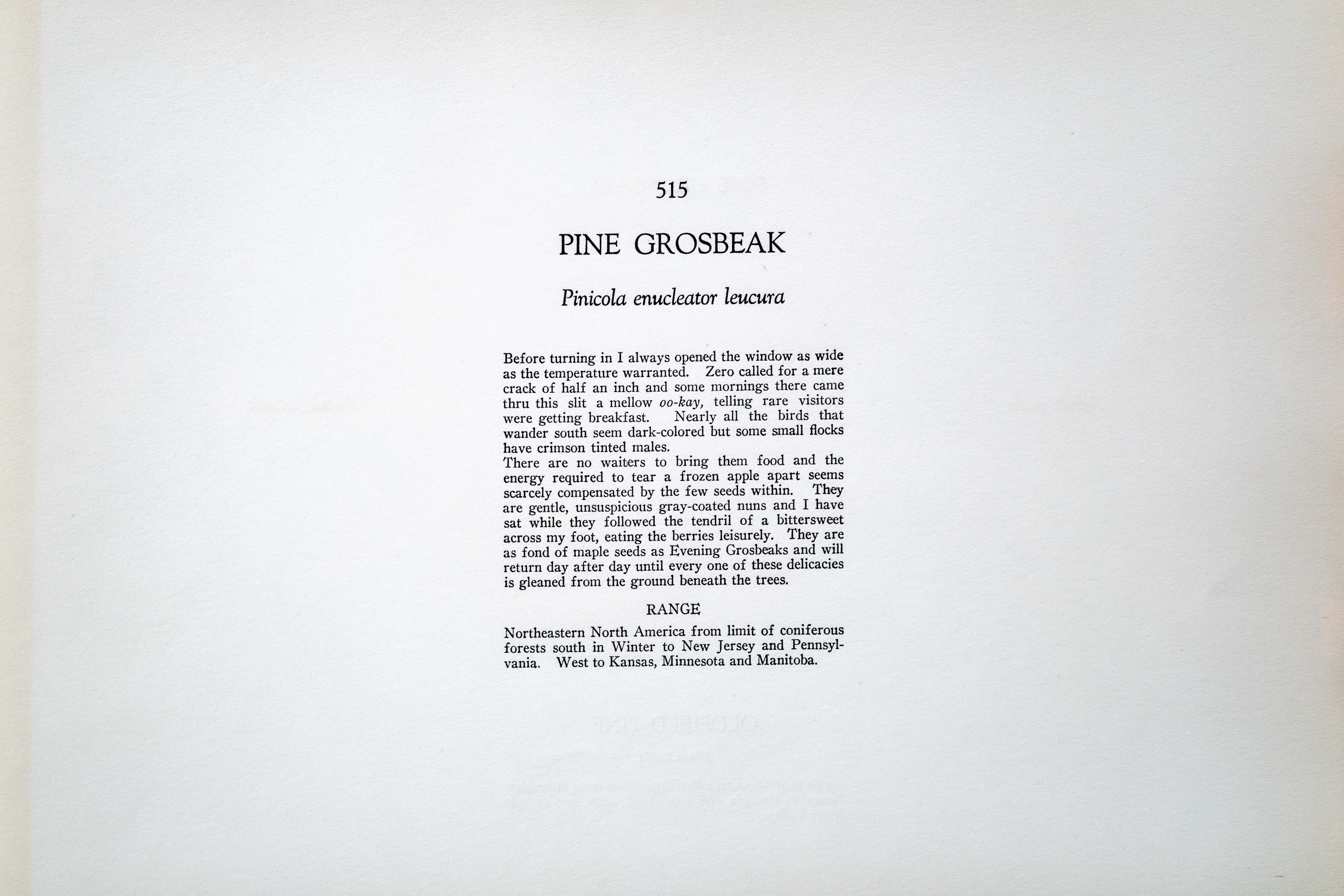 There are no waiters to bring them food and the energy required to tear a frozen apple apart seems scarcely compensated by the few seeds within. They are gentle, unsuspicious gray-coated nuns and I have sat while they followed the tendril of a bittersweet across my foot, eating the berries leisurely. They are as fond of maple seeds as Evening Grosbeaks and will return day after day until every one of these delicacies is gleaned from the ground beneath the trees.