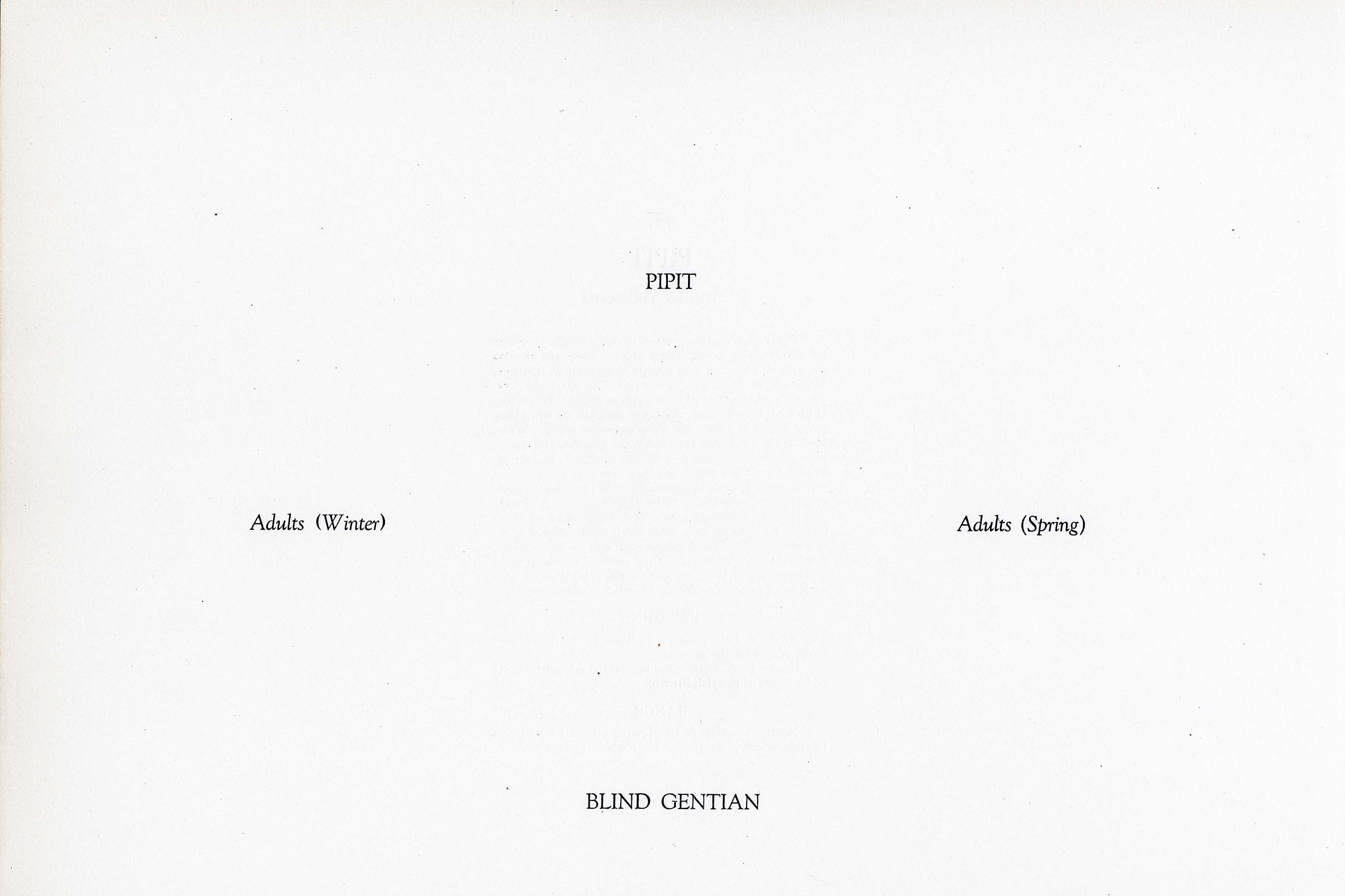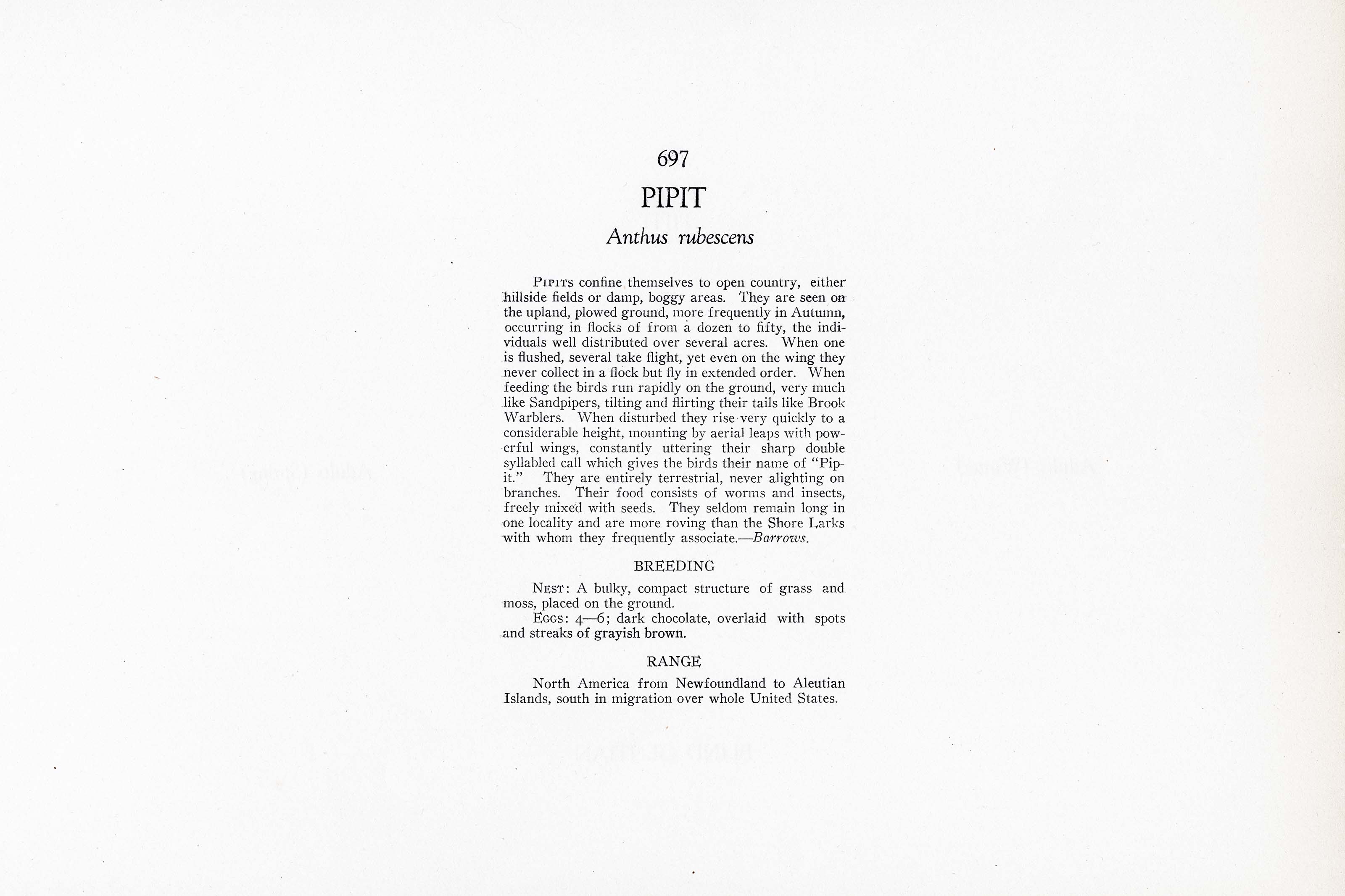PIPITS confine themselves to open country, either hillside fields or damp, boggy areas. They are seen on the upland, plowed ground, more frequently in Autumn, occurring in flocks of from a dozen to fifty, the individuals well distributed over several acres. When one is flushed, several take flight, yet even on the wing they never collect in a flock but fly in extended order. When feeding the birds run rapidly on the ground, very much like Sandpipers, tilting and flirting their tails like Brook Warblers. When disturbed they rise very quickly to a considerable height, mounting by aerial leaps with powerful wings, constantly uttering their sharp double syllabled call which gives the birds their name of "Pipit." They are entirely terrestrial, never alighting on branches. Their food consists of worms and insects, freely mixed with seeds. They seldom remain long in one locality and are more roving than the Shore Larks with whom they frequently associate. —Barrows.