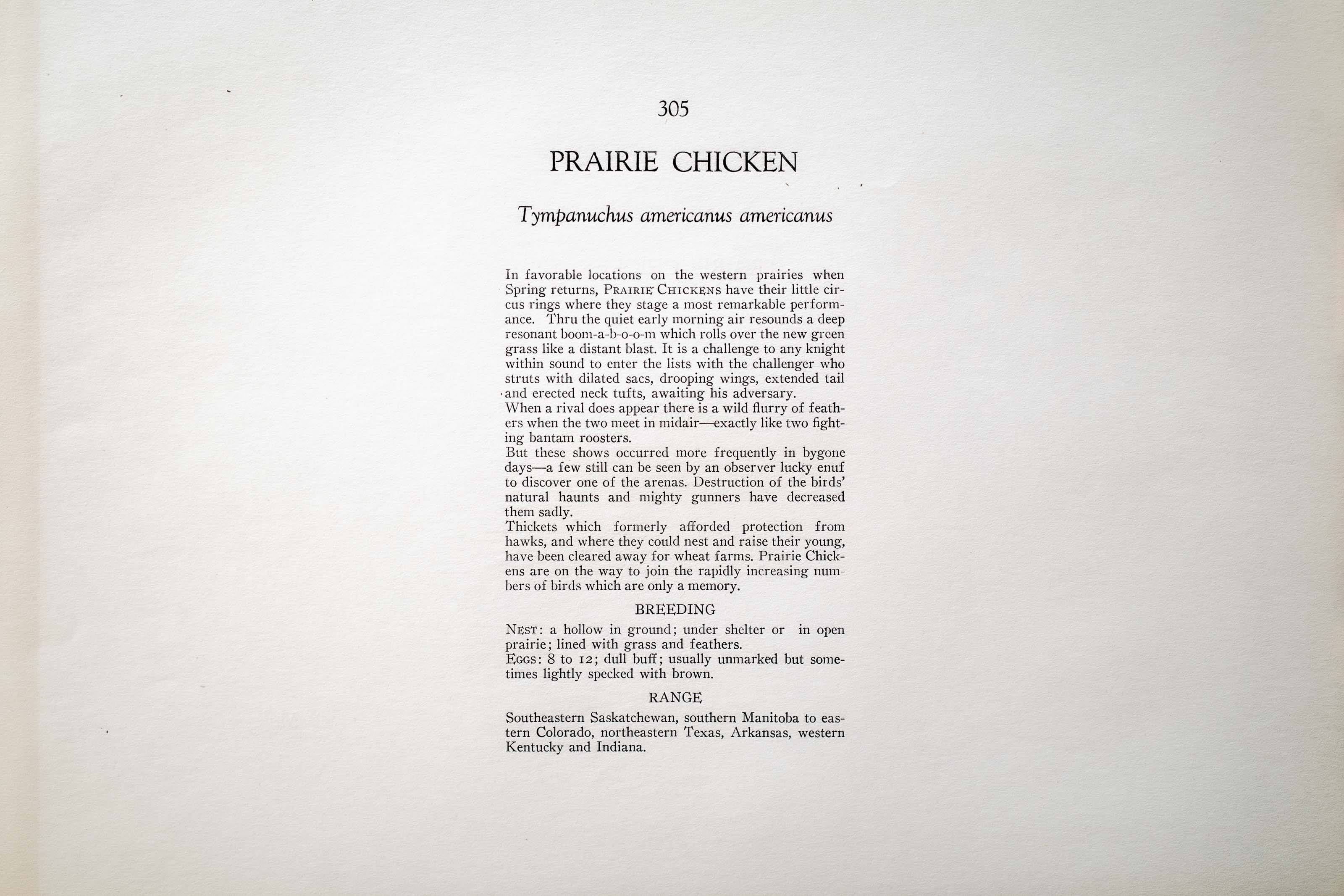 Thickets which formerly afforded protection from hawks, and where they could nest and raise their young, have been cleared away for wheat farms. Prairie Chickens are on the way to join the rapidly increasing numbers of birds which are only a memory.