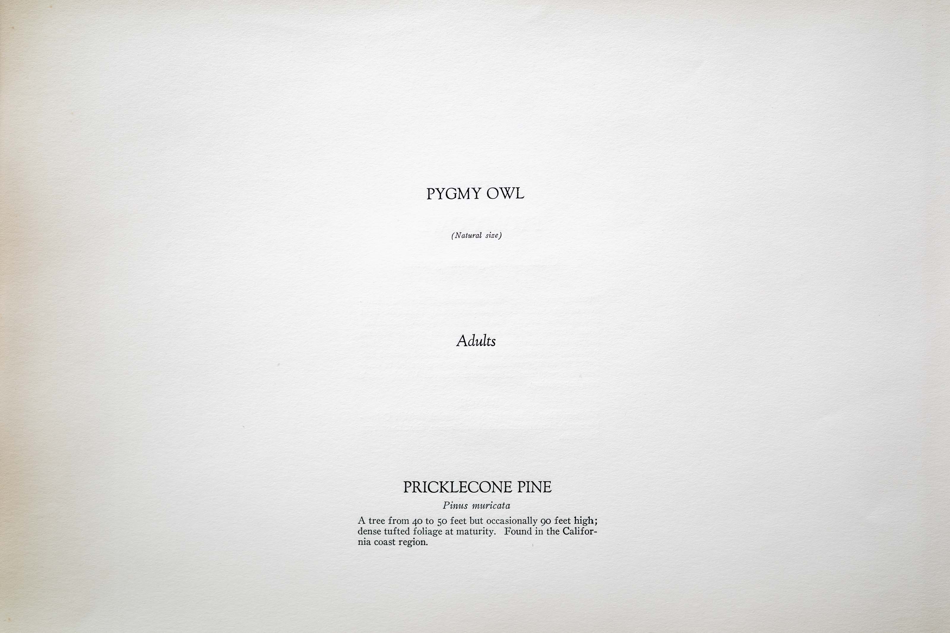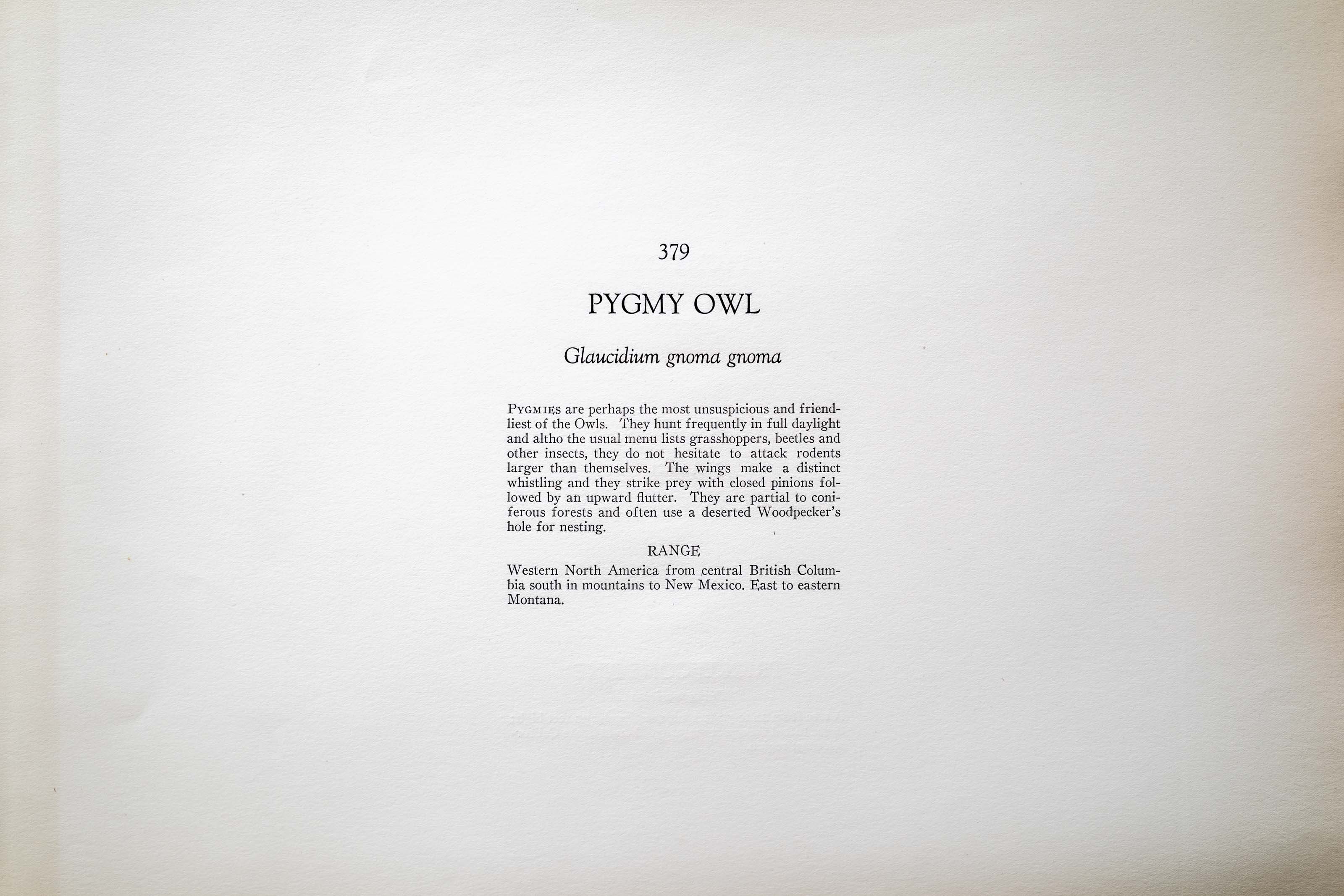 PYGMIES are perhaps the most unsuspicious and friendliest of the Owls. They hunt frequently in full daylight and altho the usual menu lists grasshoppers, beetles and other insects, they do not hesitate to attack rodents larger than themselves. The wings make a distinct whistling and they strike prey with closed pinions followed by an upward flutter. They are partial to coniferous forests and often use a deserted Woodpecker's hole for nesting.