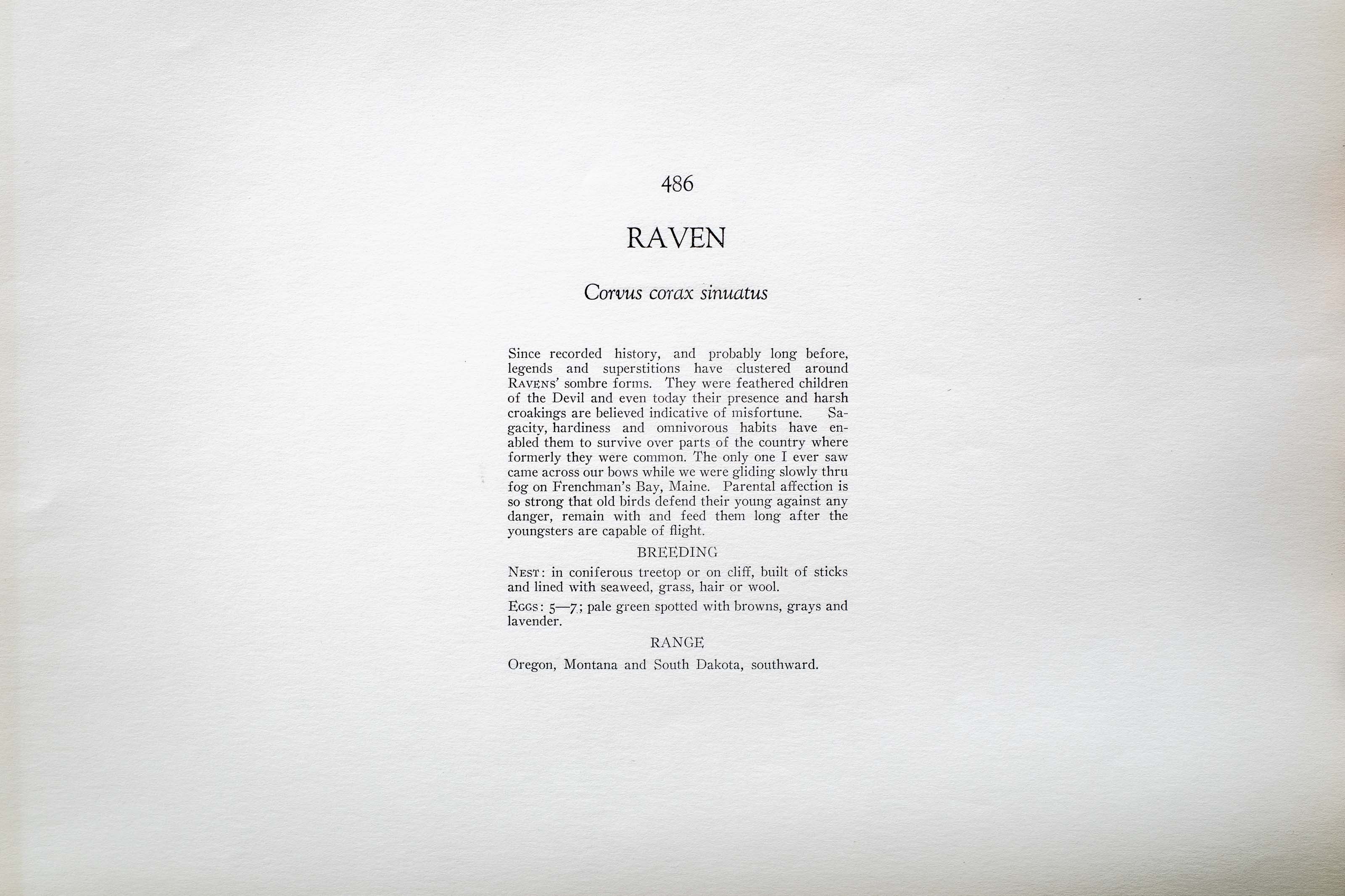 Since recorded history, and probably long before, legends and superstitions have clustered around RAVENS' sombre forms. They were feathered children of the Devil and even today their presence and harsh croakings are believed indicative of misfortune. Sagacity, hardiness and omnivorous habits have enabled them to survive over parts of the country where formerly they were common. The only one I ever saw came across our bows while we were gliding slowly thru fog on Frenchman's Bay, Maine. Parental affection is so strong that old birds defend their young against any danger, remain with and feed them long after the youngsters are capable of flight.