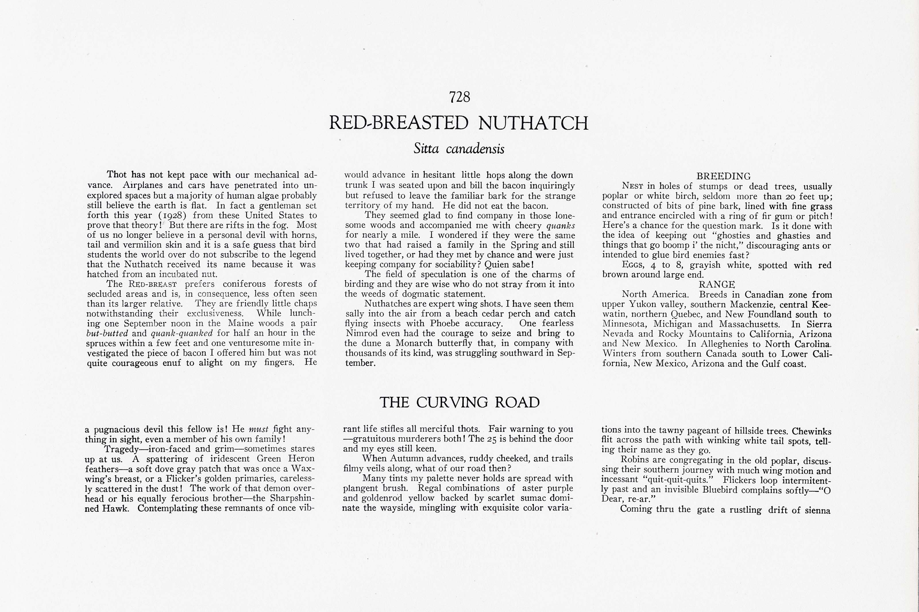 Thot has not kept pace with our mechanical advance. Airplanes and cars have penetrated into unexplored spaces but a majority of human algae probably still believe the earth is flat. In fact a gentleman set forth this year (1928) from these United States to prove that theory! But there are rifts in the fog. Most of us no longer believe in a personal devil with horns, tail and vermilion skin and it is a safe guess that bird students the world over do not subscribe to the legend that the Nuthatch received its name because it was hatched from an incubated nut.