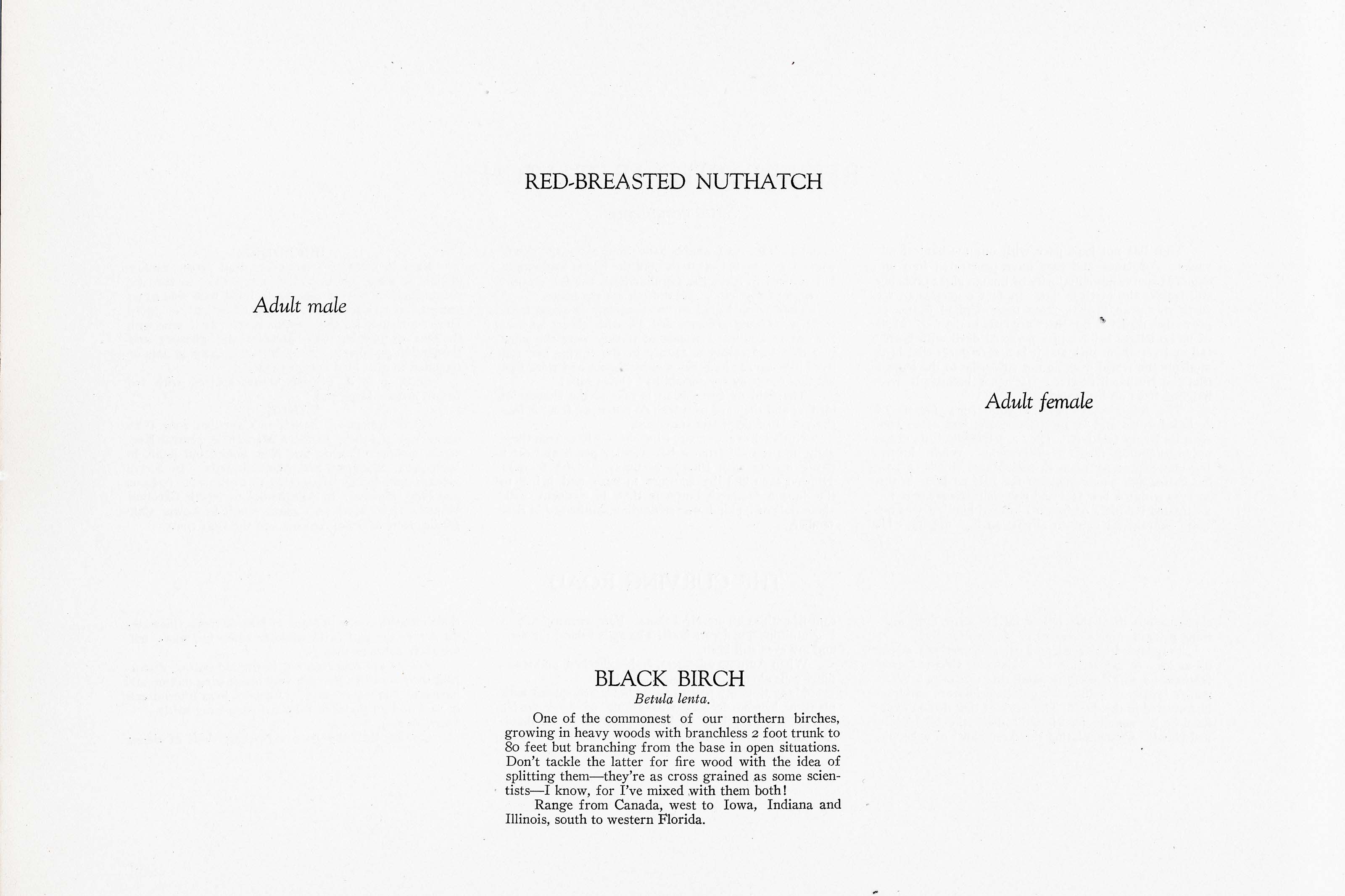 The RED-BREAST prefers coniferous forests of secluded areas and is, in consequence, less often seen than its larger relative. They are friendly little chaps notwithstanding their exclusiveness. While lunching one September noon in the Maine woods a pair but-butted and quank-quanked for half an hour in the spruces within a few feet and one venturesome mite investigated the piece of bacon I offered him but was not quite courageous enuf to alight on my fingers. He would advance in hesitant little hops along the down trunk I was seated upon and bill the bacon inquiringly but refused to leave the familiar bark for the strange territory of my hand. He did not eat the bacon.