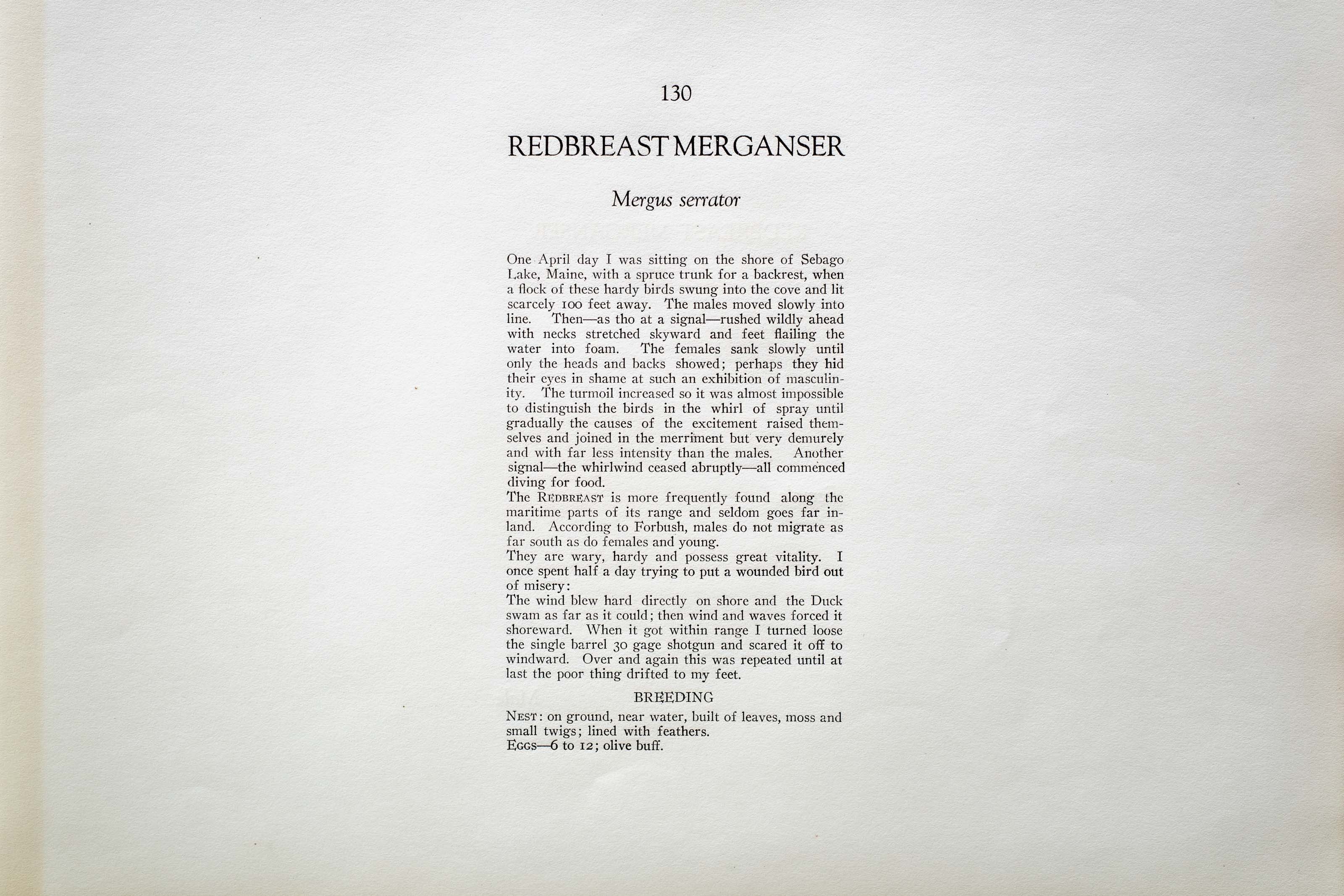 One April day I was sitting on the shore of Sebago Lake, Maine, with a spruce trunk for a backrest, when a flock of these hardy birds swung into the cove and lit scarcely 100 feet away. The males moved slowly into line. Then — as tho at a signal — rushed wildly ahead with necks stretched skyward and feet flailing the water into foam. The females sank slowly until only the heads and backs showed; perhaps they hid their eyes in shame at such an exhibition of masculinity. The turmoil increased so it was almost impossible to distinguish the birds in the whirl of spray until gradually the causes of the excitement raised themselves and joined in the merriment but very demurely and with far less intensity than the males. Another signal — the whirlwind ceased abruptly — all commenced diving for food.