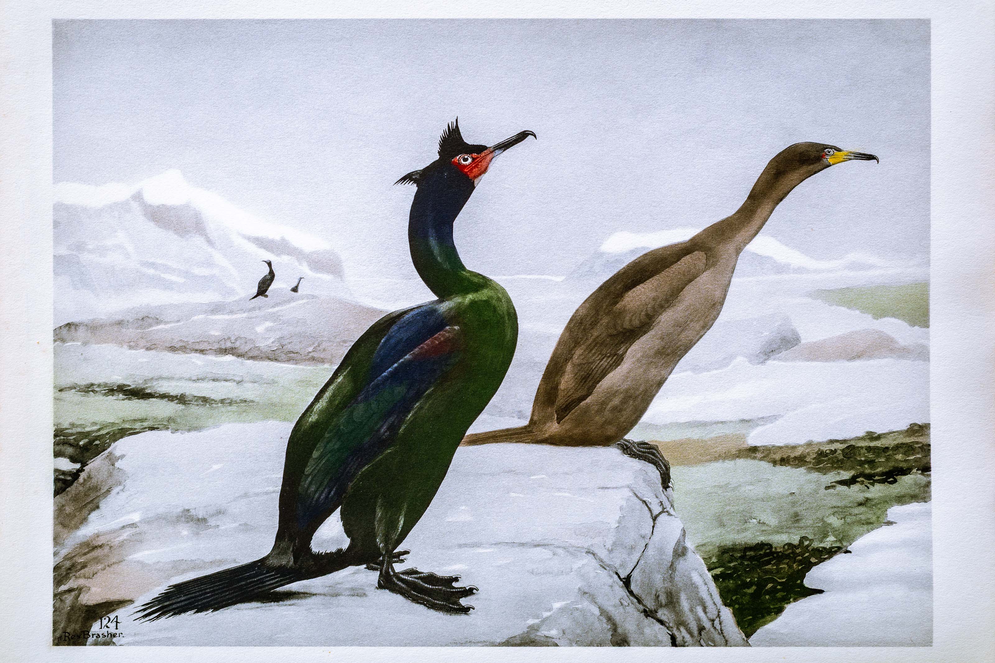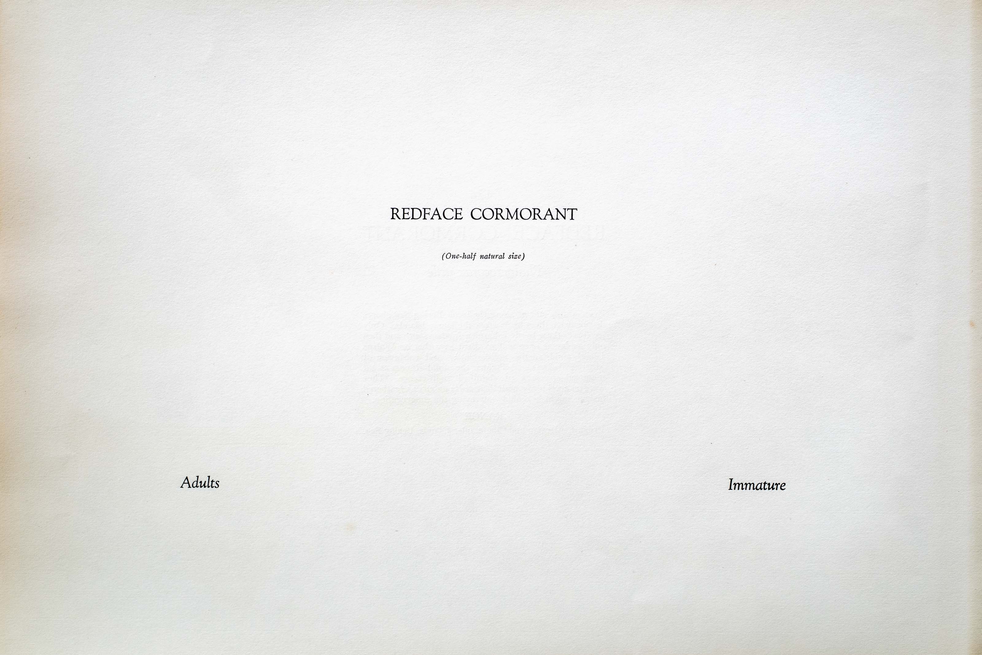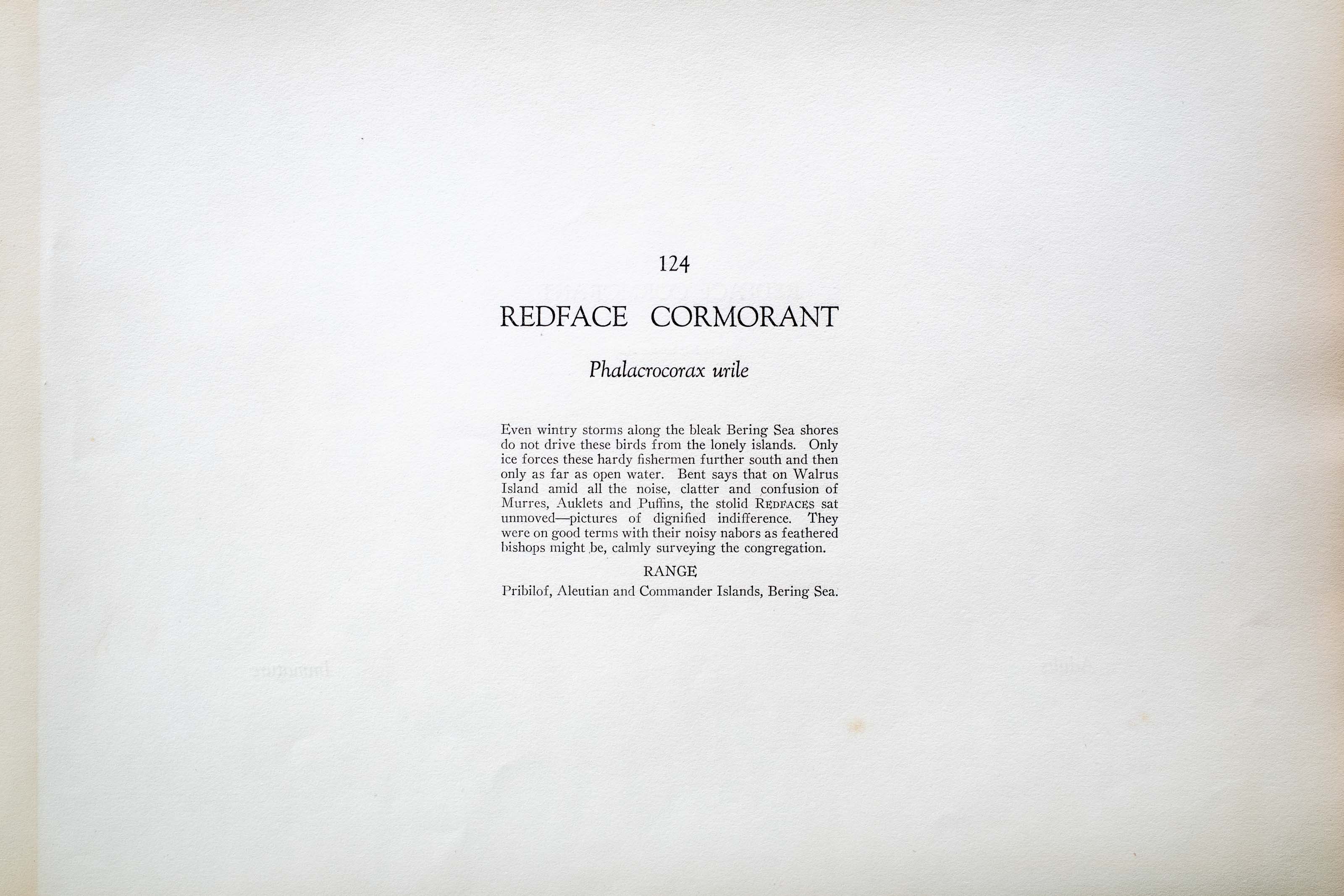 Even wintry storms along the bleak Bering Sea shores do not drive these birds from the lonely islands. Only ice forces these hardy fishermen further south and then only as far as open water. Bent says that on Walrus Island amid all the noise, clatter and confusion of Murres, Auklets and Puffins, the stolid REDFACES sat unmoved — pictures of dignified indifference. They were on good terms with their noisy nabors as feathered bishops might be, calmly surveying the congregation.