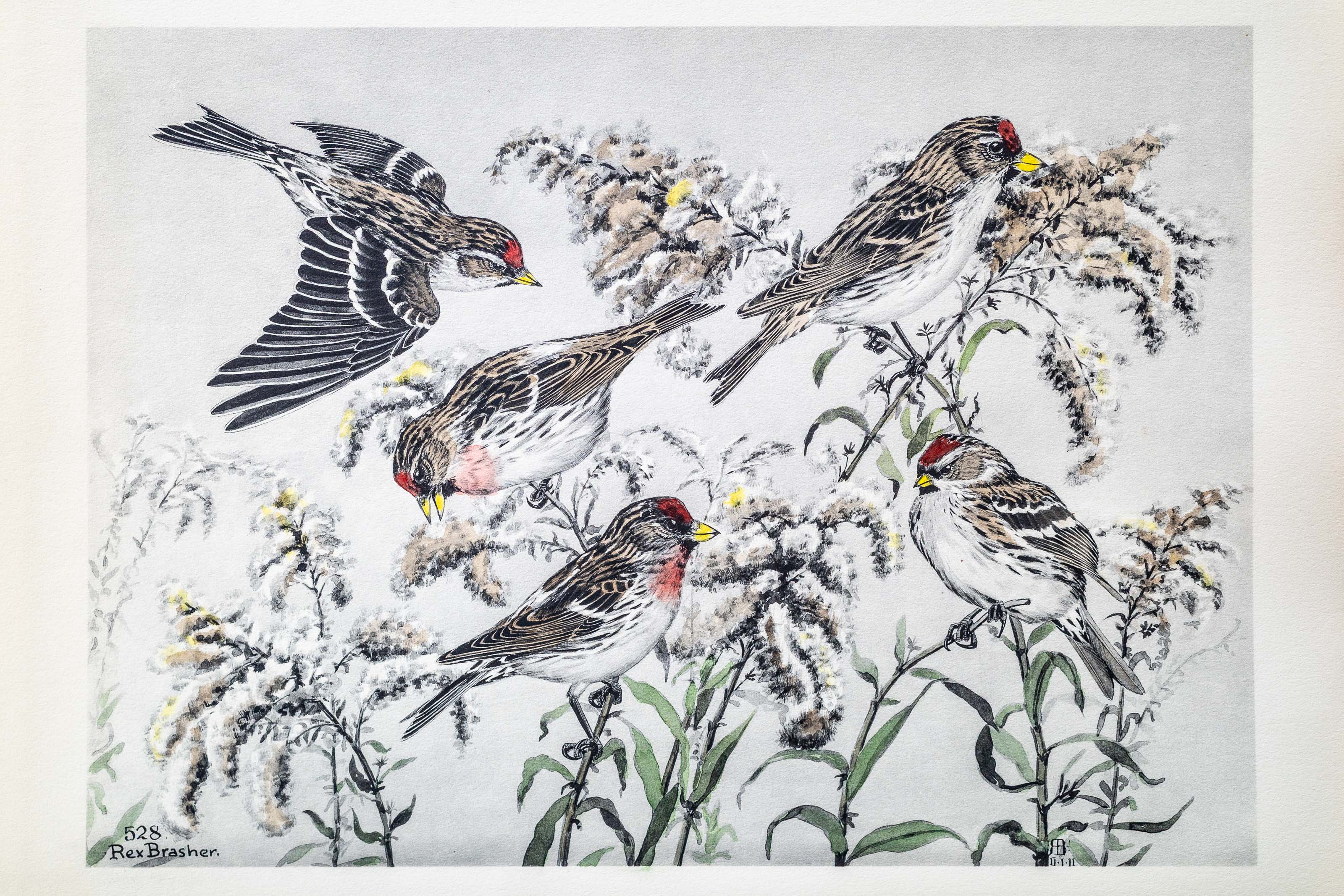 A flock of these crimson-crown gypsies feeding, talking and warbling, enlivens the dreariest Winter landscape. Often I have slid to one of these fiesta, when skiing and the merry crowd soon accepted me as one of them. They would alight on the skis, on a weed stalk within a few feet — or even on me! One unsuspicious bird once perched on my pipe stem and brushed my nose with its tail when looking into the bowl! The call notes and soft warblings are closely akin to those of the Goldfinch; even the dear-ee has the same plaintive intonation. Until 1928 they appeared nearly every Winter but since then there has been none in this part of Dutchess County. The pencil studies for the painting were made from the porch of my home.