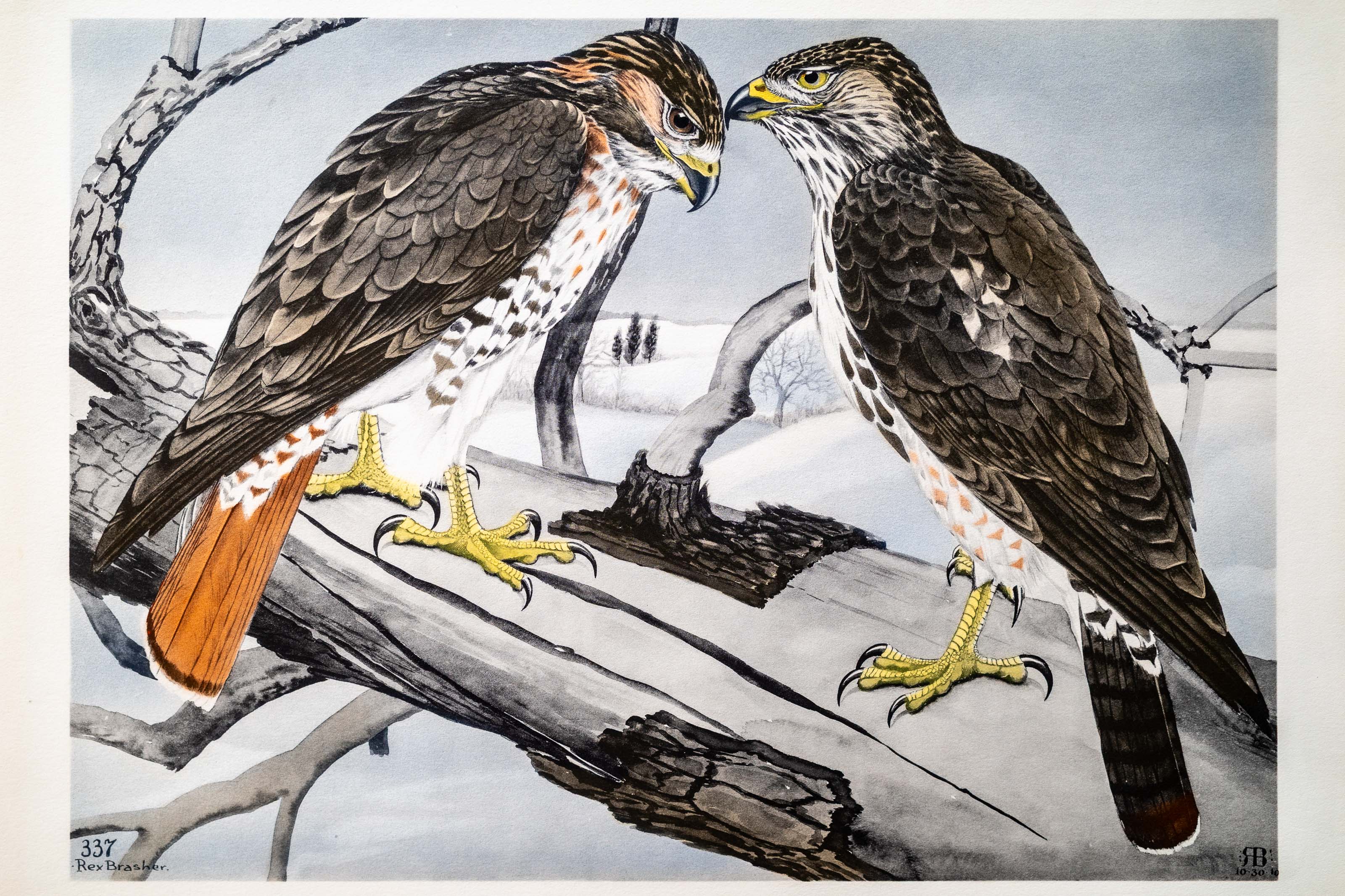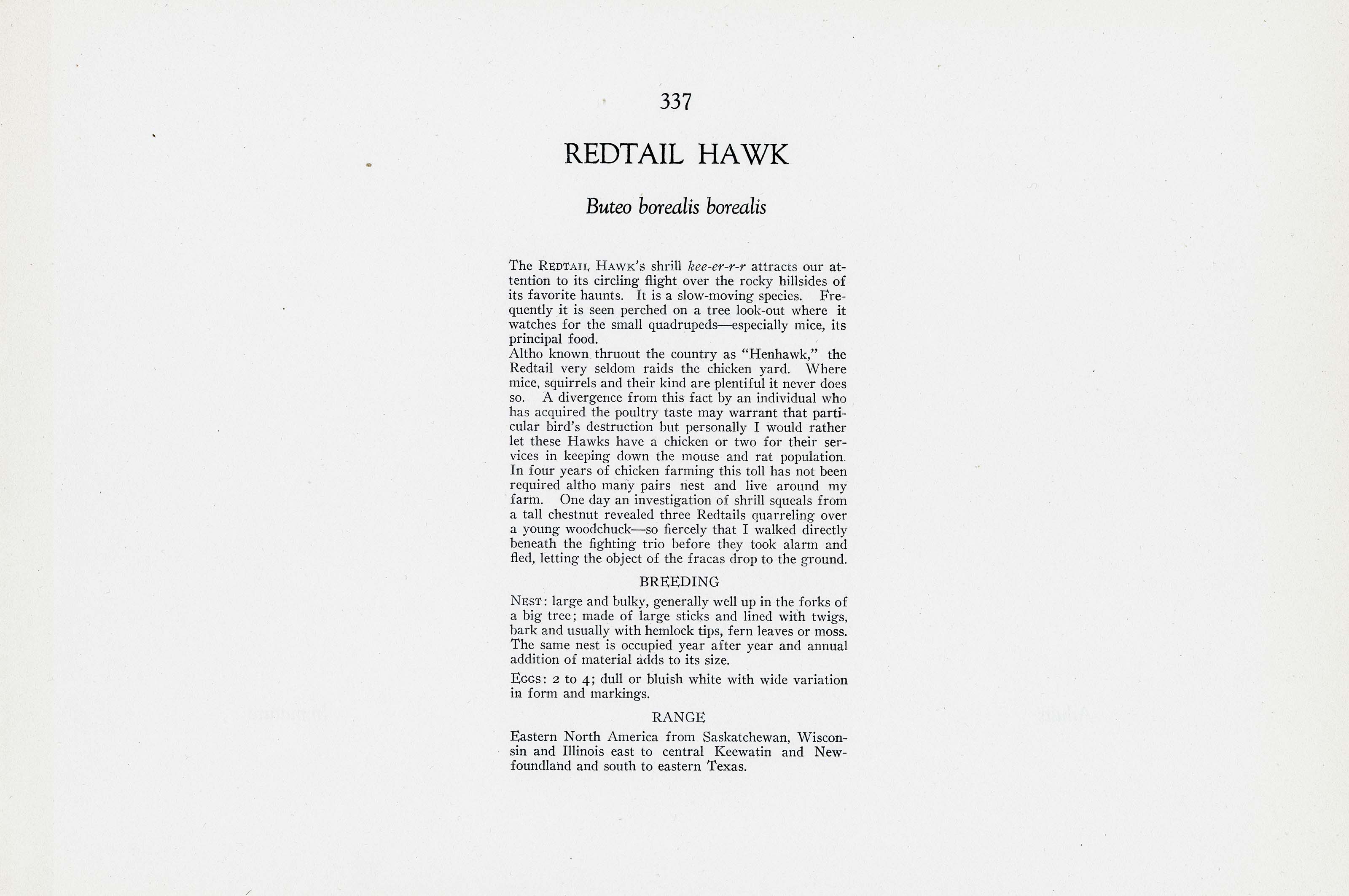 Altho known thruout the country as "Henhawk," the Redtail very seldom raids the chicken yard. Where mice, squirrels and their kind are plentiful it never does so. A divergence from this fact by an individual who has acquired the poultry taste may warrant that particular bird's destruction but personally I would rather let these Hawks have a chicken or two for their services in keeping down the mouse and rat population. In four years of chicken farming this toll has not been required altho many pairs nest and live around my farm. One day an investigation of shrill squeals from a tall chestnut revealed three Redtails quarreling over a young woodchuck — so fiercely that I walked directly beneath the fighting trio before they took alarm and fled, letting the object of the fracas drop to the ground.