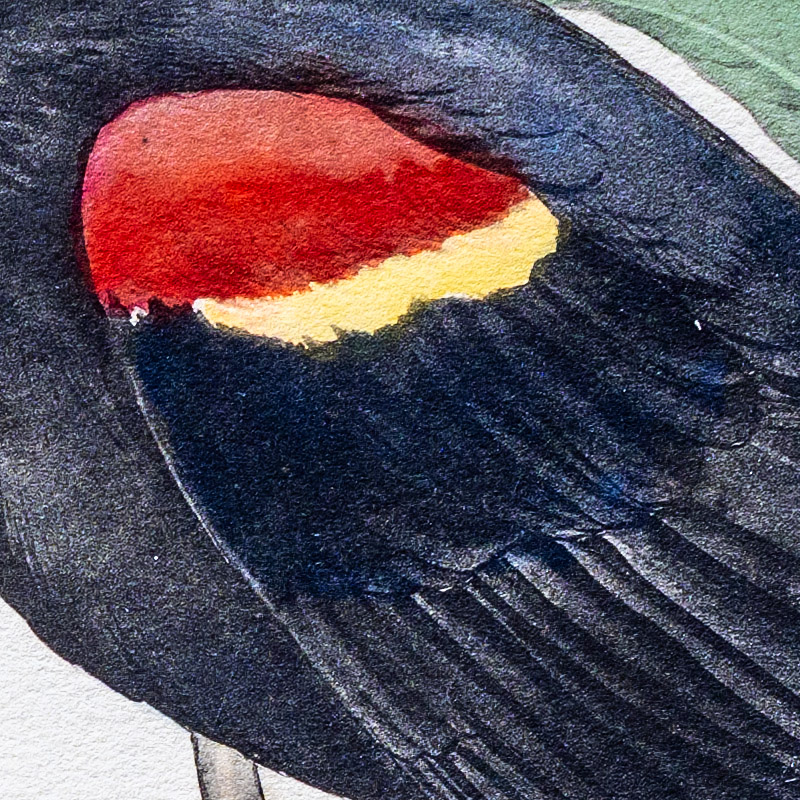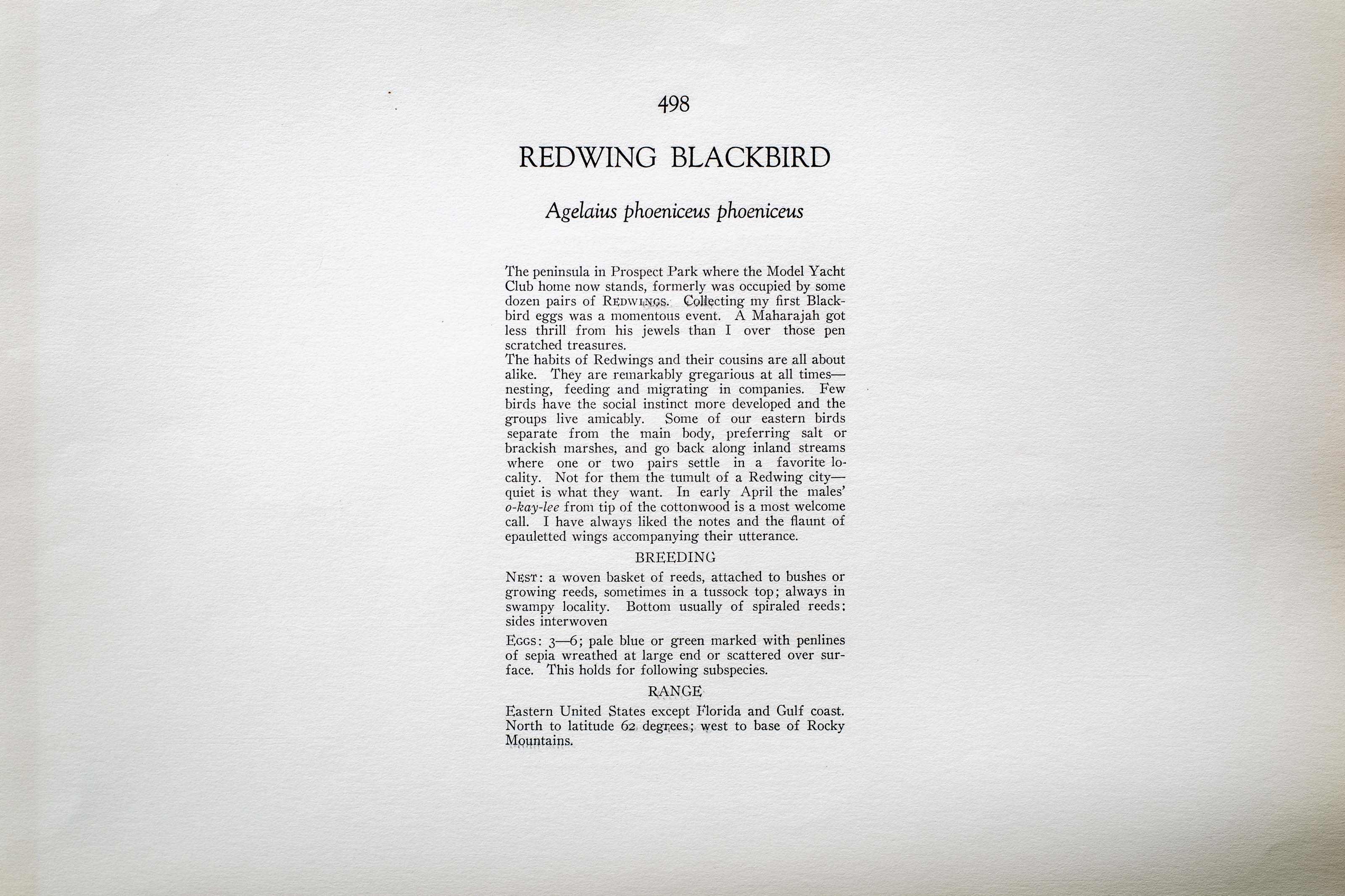 The habits of Redwings and their cousins are all about alike. They are remarkably gregarious at all times — nesting, feeding and migrating in companies. Few birds have the social instinct more developed and the groups live amicably. Some of our eastern birds separate from the main body, preferring salt or brackish marshes, and go back along inland streams where one or two pairs settle in a favorite locality. Not for them the tumult of a Redwing city — quiet is what they want. In early April the males' o-kay-lee from tip of the cottonwood is a most welcome call. I have always liked the notes and the flaunt of epauletted wings accompanying their utterance.