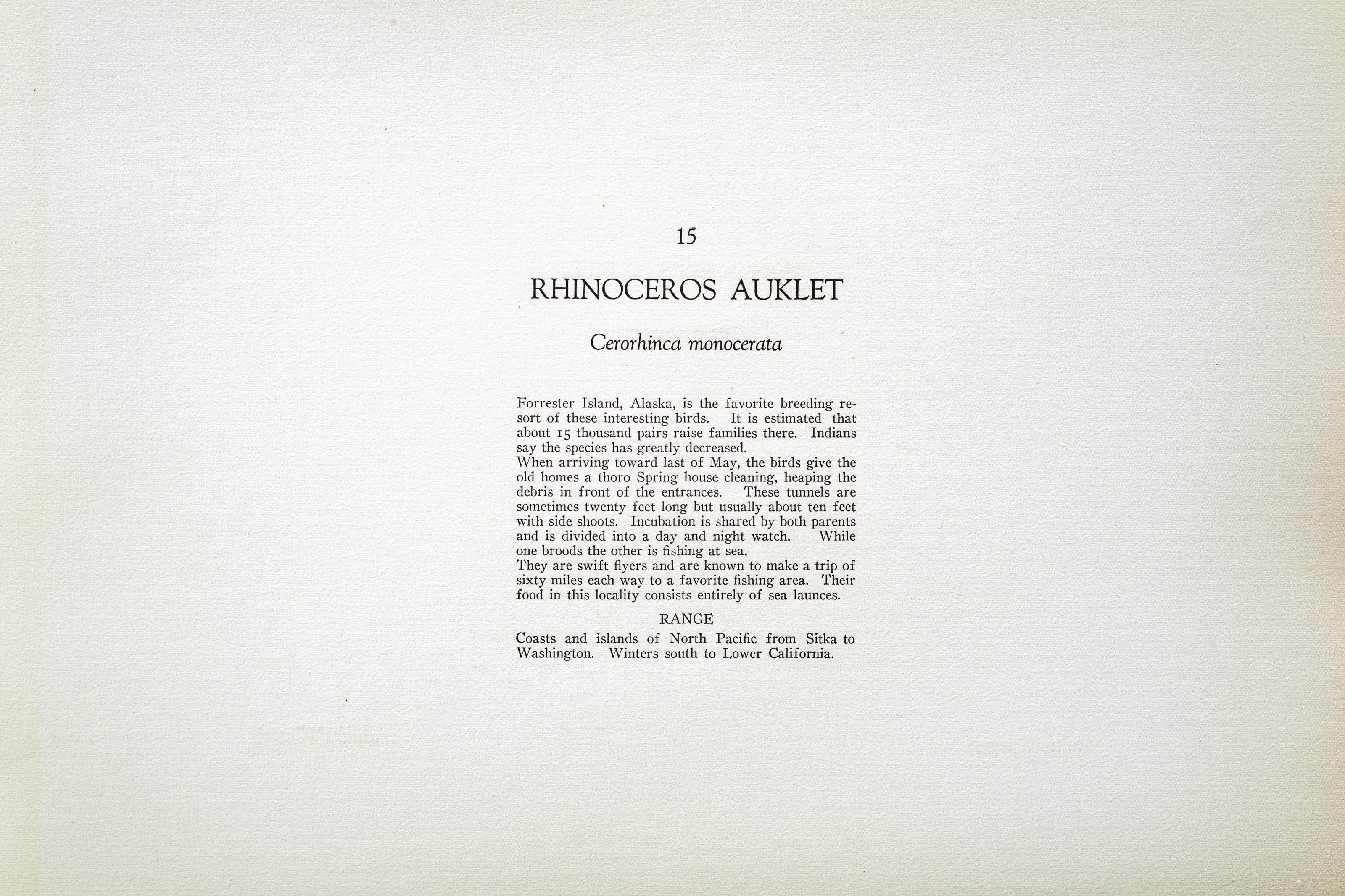 Forrester Island, Alaska, is the favorite breeding resort of these interesting birds. It is estimated that about 15 thousand pairs raise families there. Indians say the species has greatly decreased.