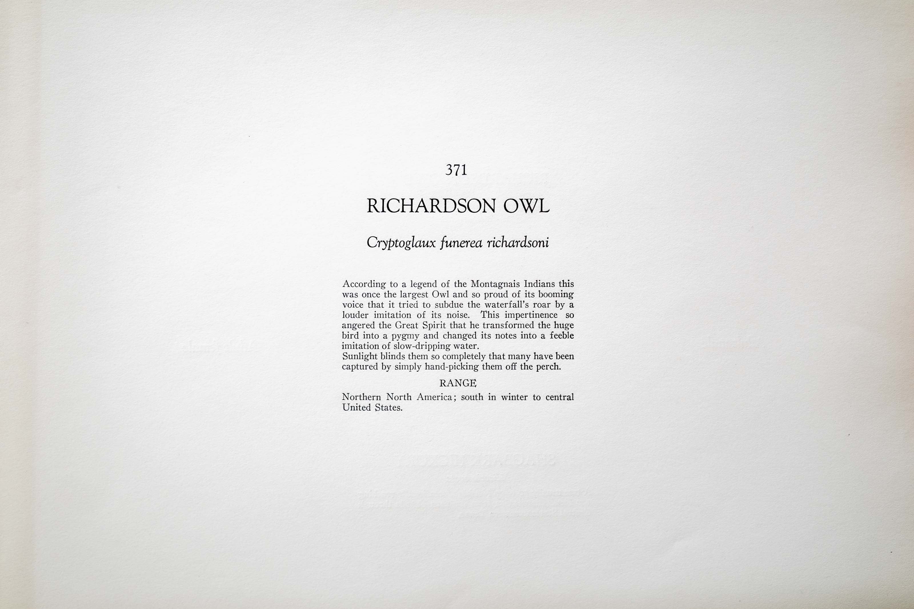 According to a legend of the Montagnais Indians this was once the largest Owl and so proud of its booming voice that it tried to subdue the waterfall's roar by a louder imitation of its noise. This impertinence so angered the Great Spirit that he transformed the huge bird into a pygmy and changed its notes into a feeble imitation of slow-dripping water.