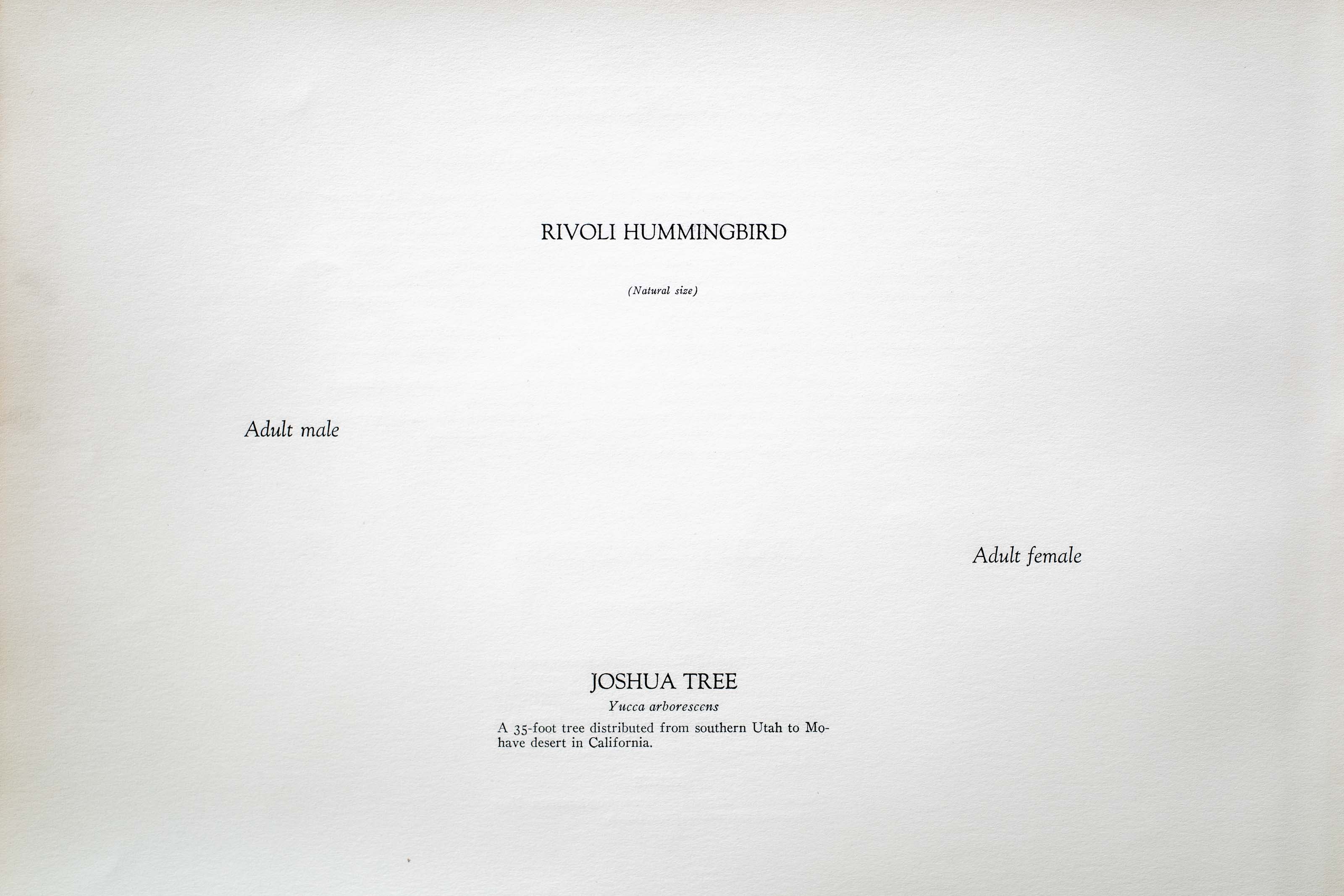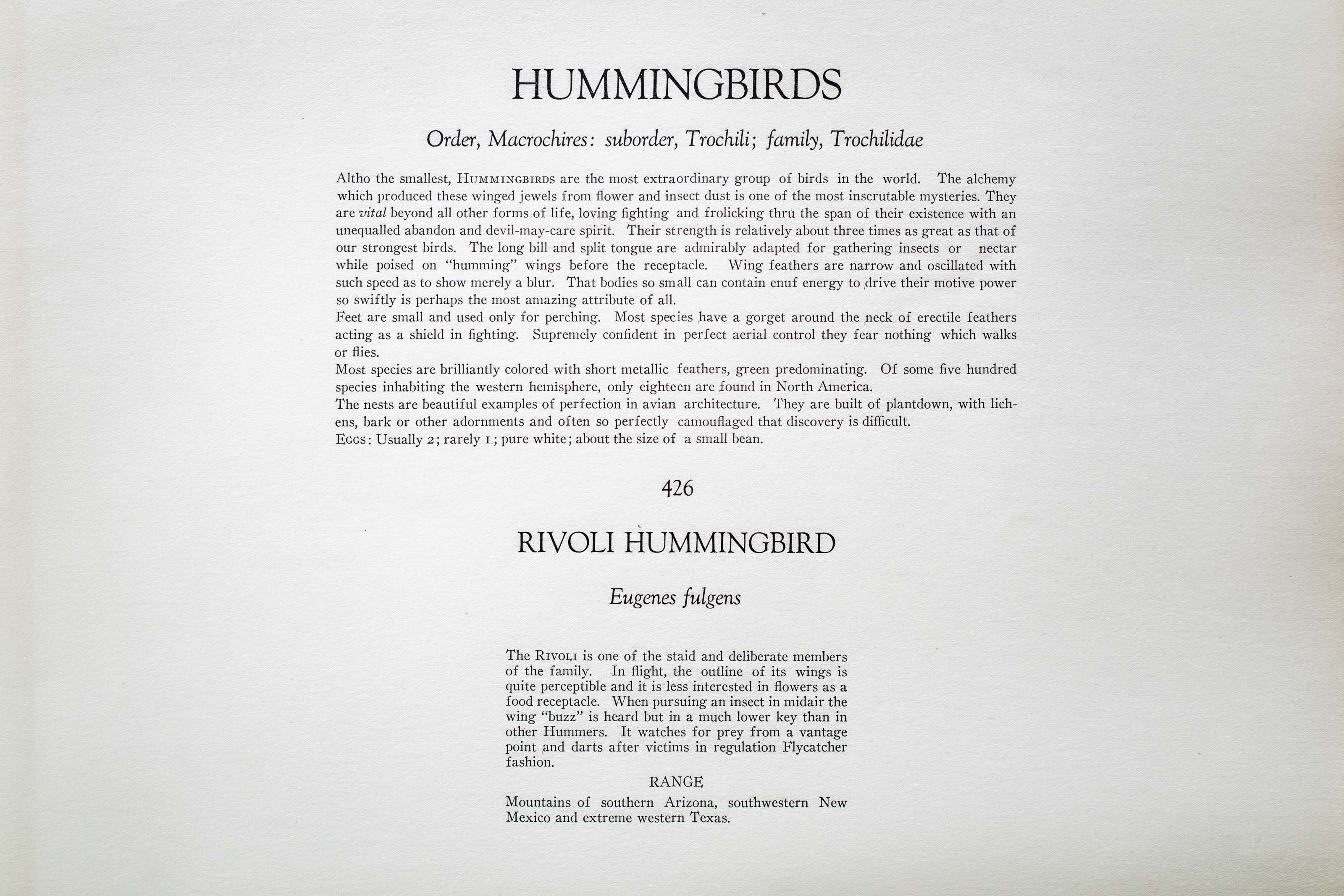 The RIVOLI is one of the staid and deliberate members of the family. In flight, the outline of its wings is quite perceptible and it is less interested in flowers as a food receptacle. When pursuing an insect in midair the wing "buzz" is heard but in a much lower key than in other Hummers. It watches for prey from a vantage point and darts after victims in regulation Flycatcher fashion.
