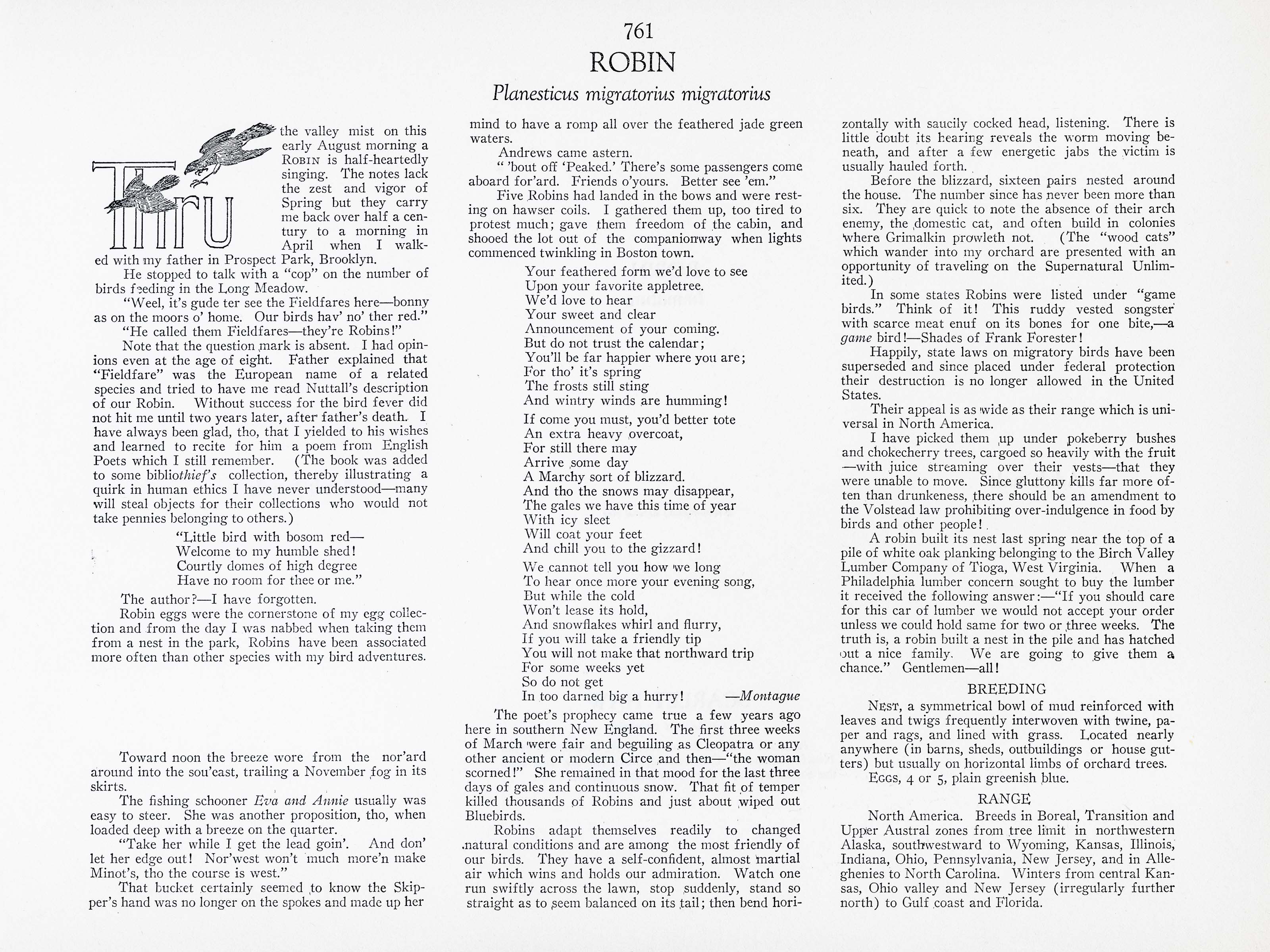 Note that the question mark is absent. I had opinions even at the age of eight. Father explained that "Fieldfare" was the European name of a related species and tried to have me read Nuttall's description of our Robin. Without success for the bird fever did not hit me until two years later, after father's death. I have always been glad, tho, that I yielded to his wishes and learned to recite for him a poem from English Poets which I still remember. (The book was added to some bibliothief's collection, thereby illustrating a quirk in human ethics I have never understood — many will steal obiects for their collections who would not take pennies belonging to others.)