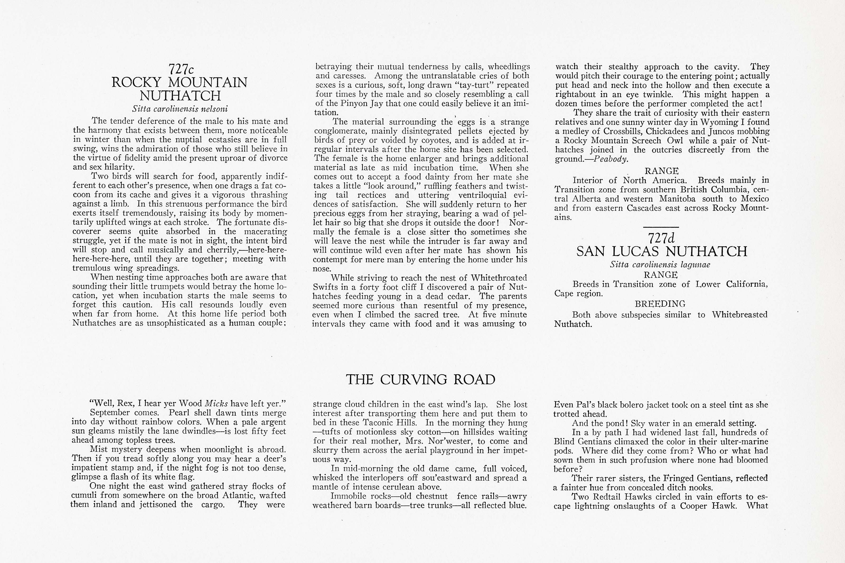 They share the trait of curiosity with their eastern relatives and one sunny winter day in Wyoming I found a medley of Crossbills, Chickadees and Juncos mobbing a Rocky Mountain Screech Owl while a pair of Nuthatches joined in the outcries discreetly from the ground. —Peabody.