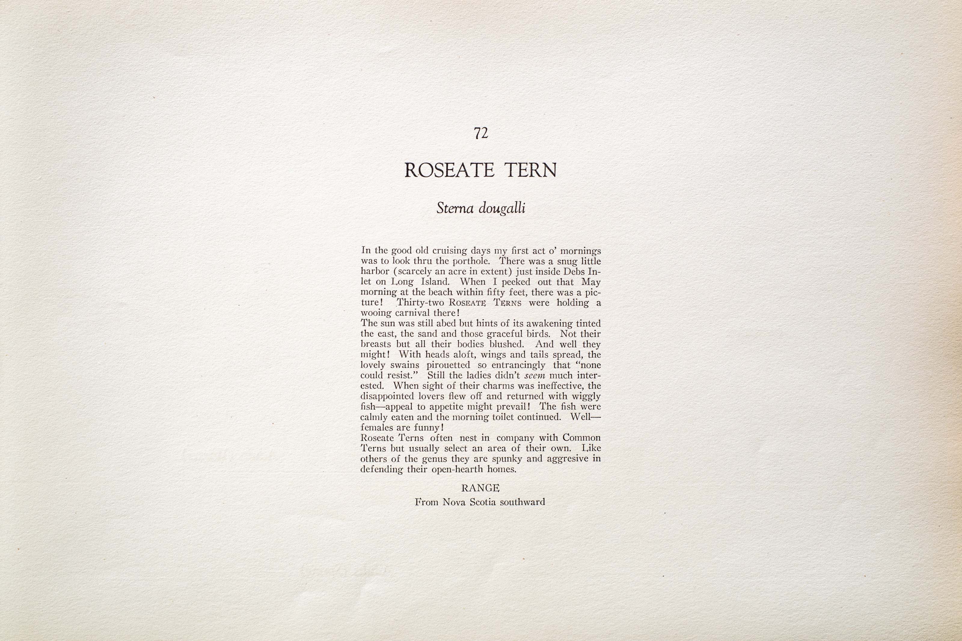 Roseate Terns often nest in company with Common Terns but usually select an area of their own. Like others of the genus they are spunky and aggressive in defending their open-hearth homes.