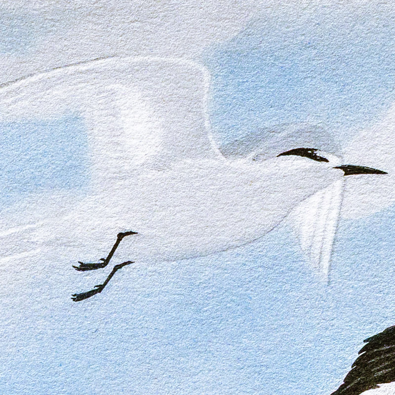 Exceeded in size only by the Caspian Tern, this species is identified by longer forked tail. They are equally tenacious of their homes altho not quite so vociferous in defense. Pearson says a colony that had been "washed out" by high tide, calmly appropriated a section of Black Skimmer land, burying or scattering the rightful owners' eggs and starting housekeeping on the stolen territory.