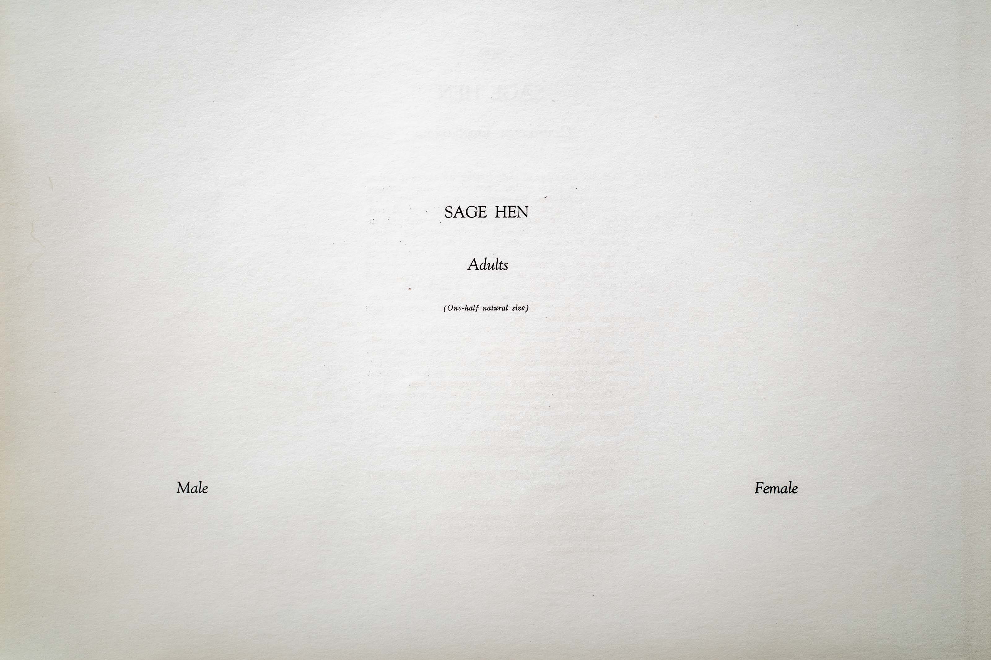 On fine mornings of early Spring, a number of ardent male SAGE HENS gather upon their marital meeting grounds and await the coming of their brides — which is not long delayed. The pompous gentlemen stand erect, with wings and tails outspread, the loose neck skin inflated and depressed with peculiar croaking sounds which have been described as loud cat-purrs, chuckling or bunk-de-bunk-bunk. All this may be bunk but the females do not seem to think so for they come sailing in from all sides and polygamus mating is accomplished with entire lack of any puritanical inhibitions.