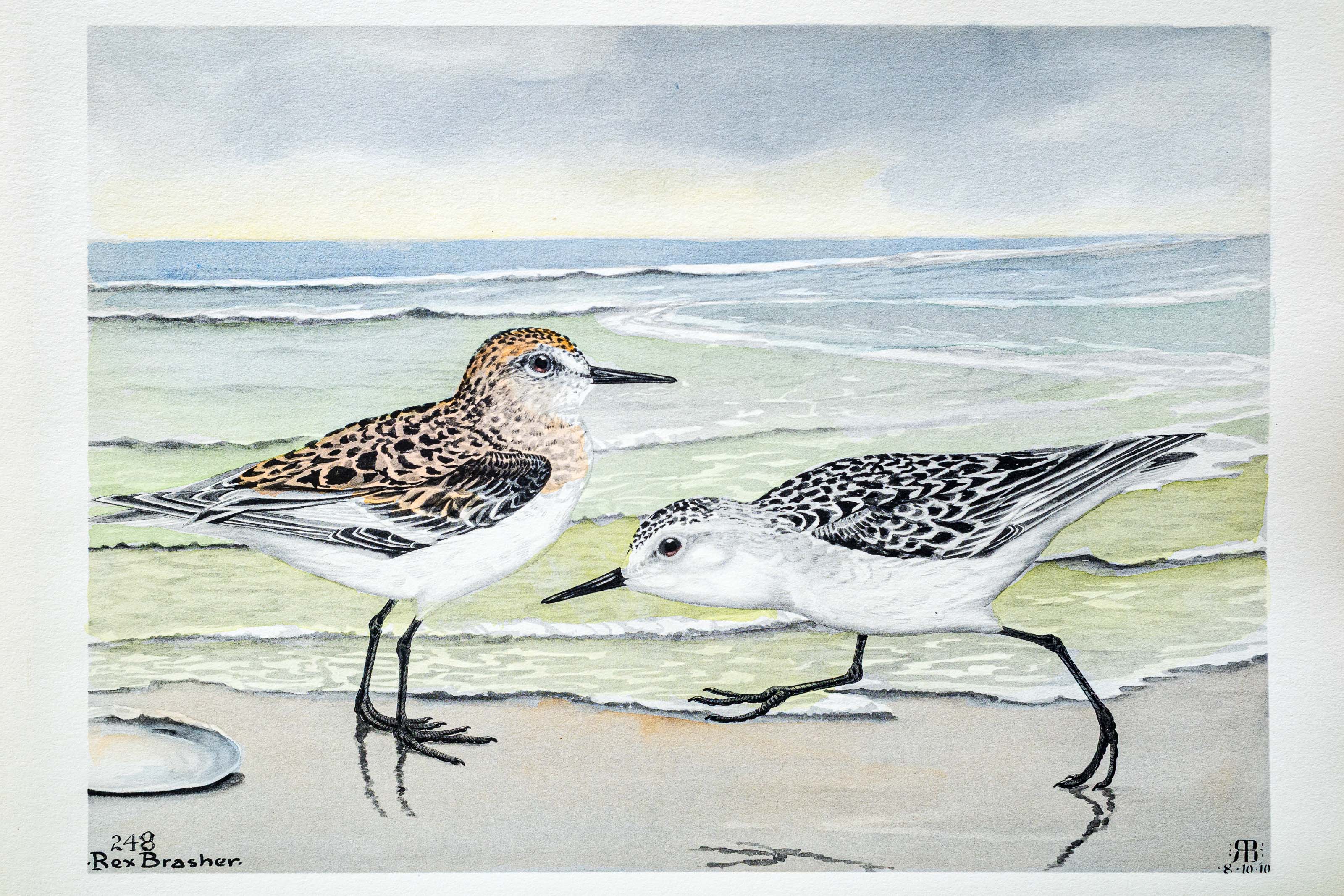 When a southeaster shoulders the white horses of the Atlantic ashore in late August, the SANDERLINGS come to the beaches in flocks of hundreds. The sea turmoil has brot an ample feast and the birds patter along the sand or plane into the gale's eye on motionless wings. Their cleverness in eluding falling surf is amazing — in all the years of observation I have never seen one caught by a breaker.
