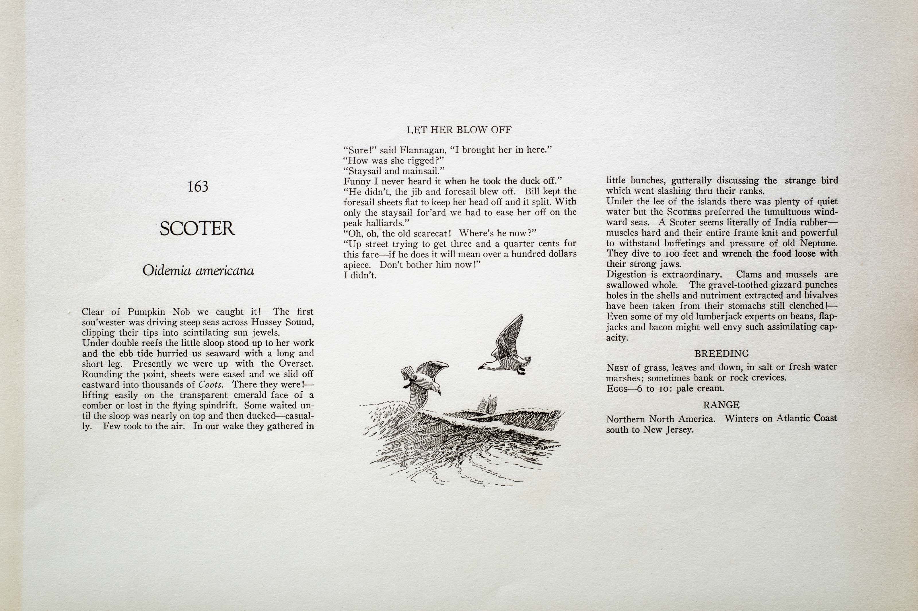 Under the lee of the islands there was plenty of quiet water but the SCOTERS preferred the tumultuous windward seas. A Scoter seems literally of India rubber — muscles hard and their entire frame knit and powerful to withstand buffetings and pressure of old Neptune. They dive to 100 feet and wrench the food loose with their strong jaws.