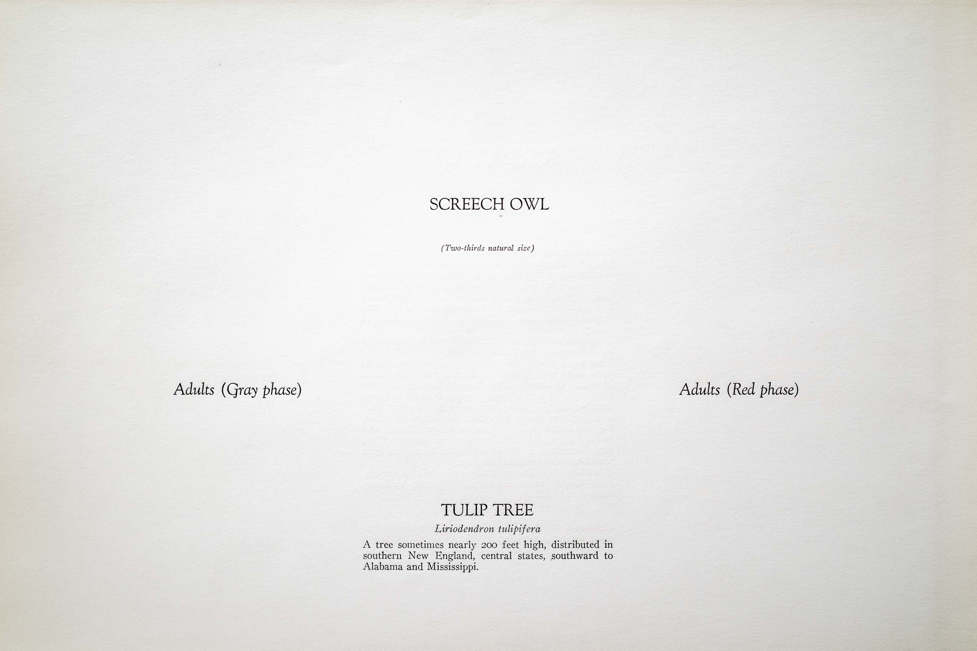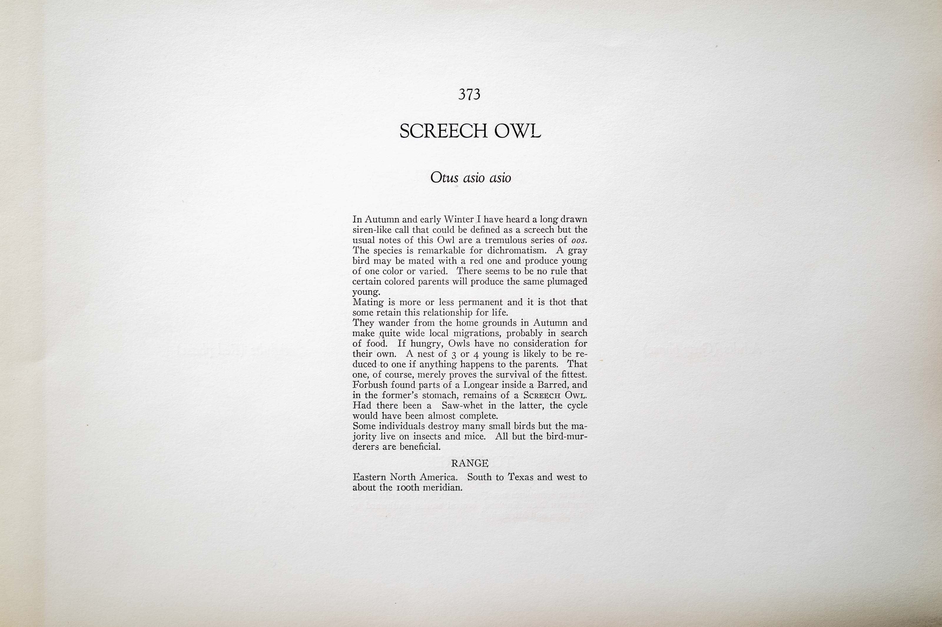 In Autumn and early Winter I have heard a long drawn siren-like call that could be defined as a screech but the usual notes of this Owl are a tremulous series of oos. The species is remarkable for dichromatism. A gray bird may be mated with a red one and produce young of one color or varied. There seems to be no rule that certain colored parents will produce the same plumaged young.