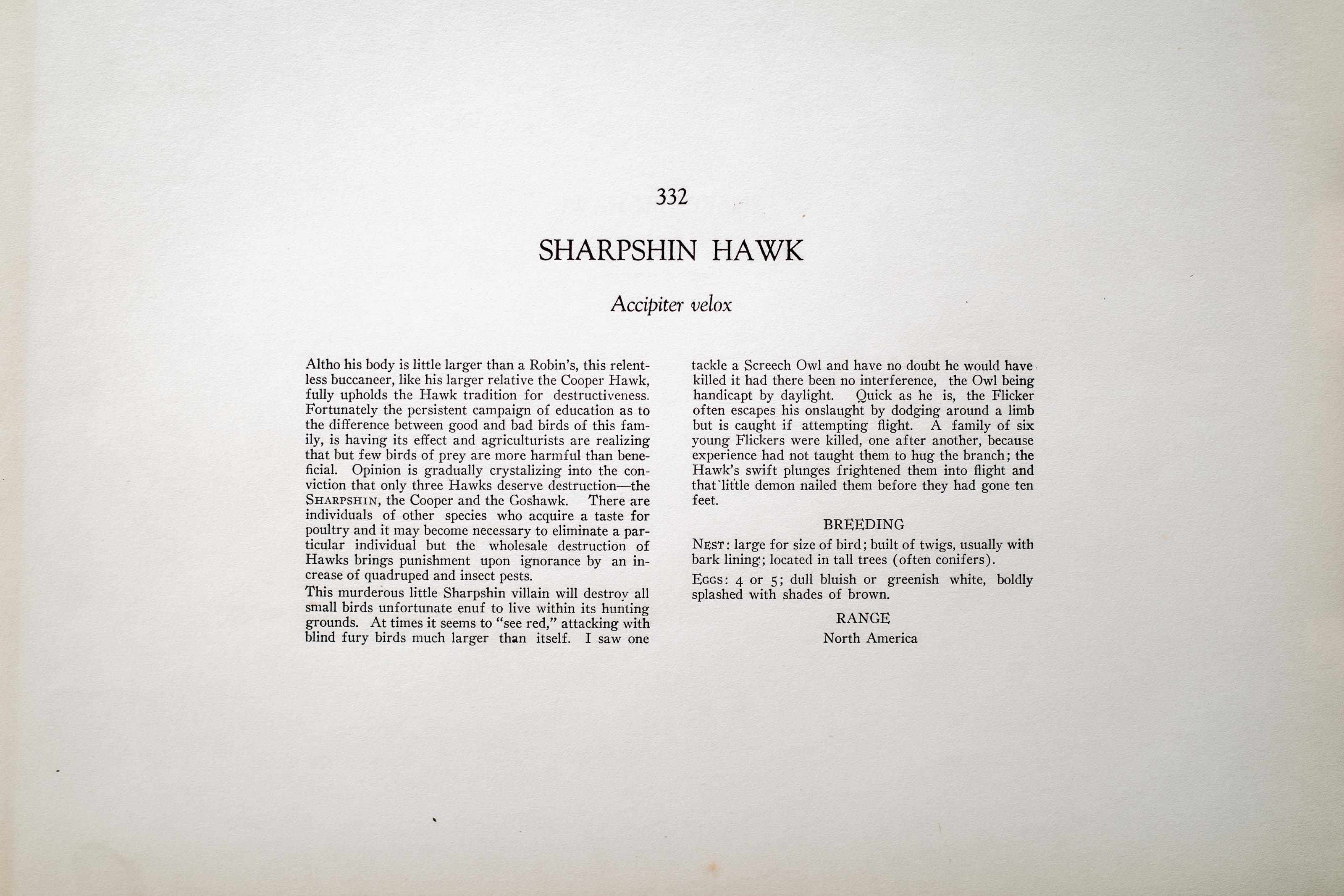 This murderous little Sharpshin villain will destroy all small birds unfortunate enuf to live within its hunting grounds. At times it seems to "see red," attacking with blind fury birds much larger than itself. I saw one tackle a Screech Owl and have no doubt he would have killed it had there been no interference, the Owl being handicapt by daylight. Quick as he is, the Flicker often escapes his onslaught by dodging around a limb but is caught if attempting flight. A family of six young Flickers were killed, one after another, because experience had not taught them to hug the branch; the Hawk's swift plunges frightened them into flight and that little demon nailed them before they had gone ten feet.
