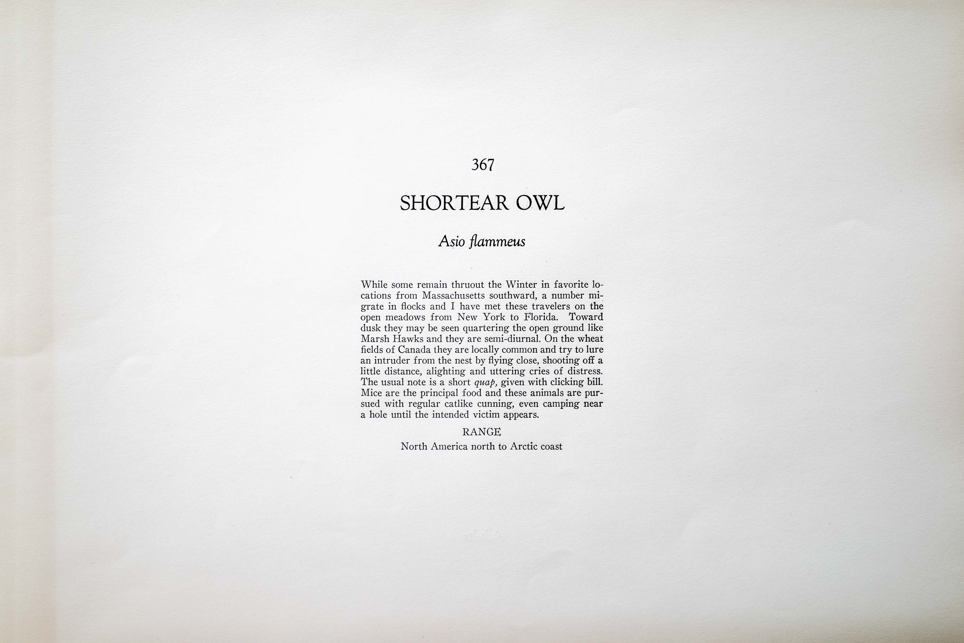 While some remain thruout the Winter in favorite locations from Massachusetts southward, a number migrate in flocks and I have met these travelers on the meadows from New York to Florida. Toward dusk they may be seen quartering the open ground like Marsh Hawks and they are semi-diurnal. On the wheat fields of Canada they are locally common and try to lure an intruder from the nest by flying close, shooting off a little distance, alighting and uttering cries of distress. The usual note is a short quap, given with clicking bill. Mice are the principal food and these animals are pursued with regular catlike cunning, even camping near a hole until the intended victim appears.