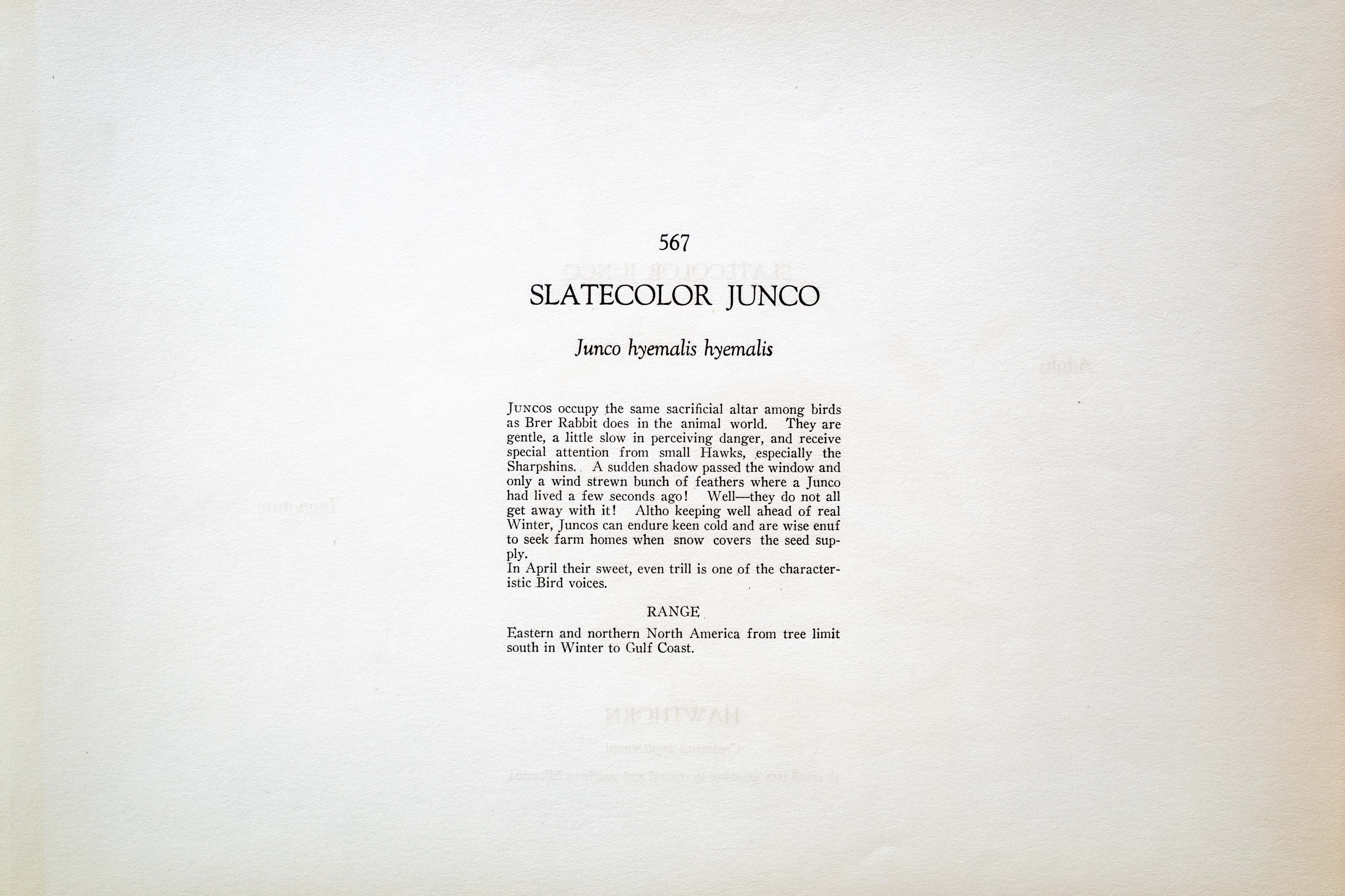 JUNCOS occupy the same sacrificial altar among birds as Brer Rabbit does in the animal world. They are gentle, a little slow in perceiving danger, and receive special attention from small Hawks, especially the Sharpshins. A sudden shadow passed the window and only a wind strewn bunch of feathers where a Junco had lived a few seconds ago! Well—they do not all get away with it! Altho keeping well ahead of real Winter, Juncos can endure keen cold and are wise enuf to seek farm homes when snow covers the seed supply.