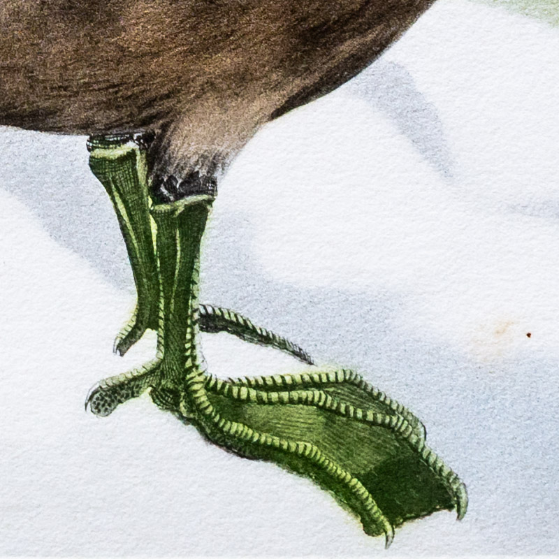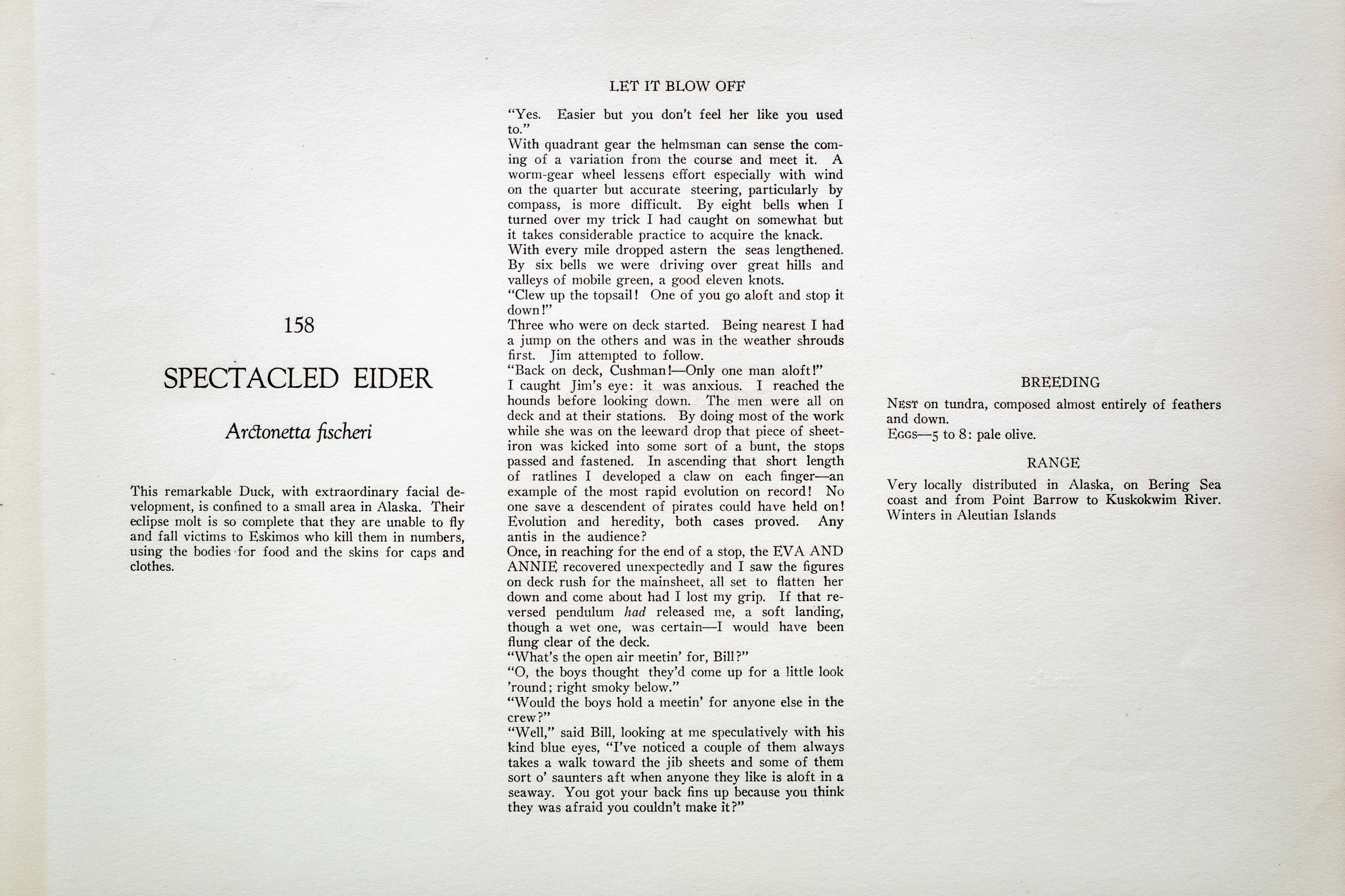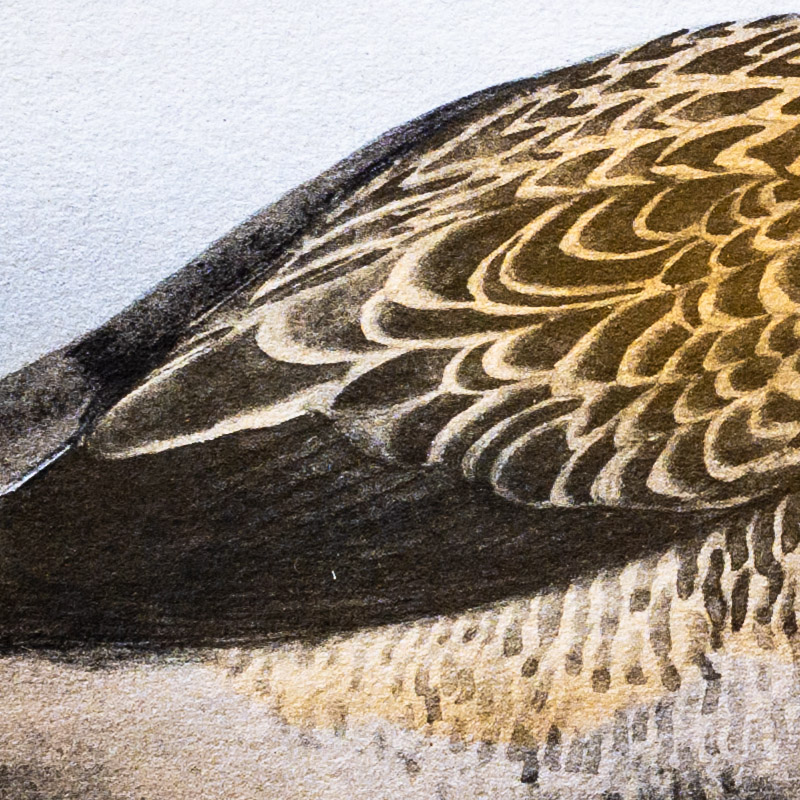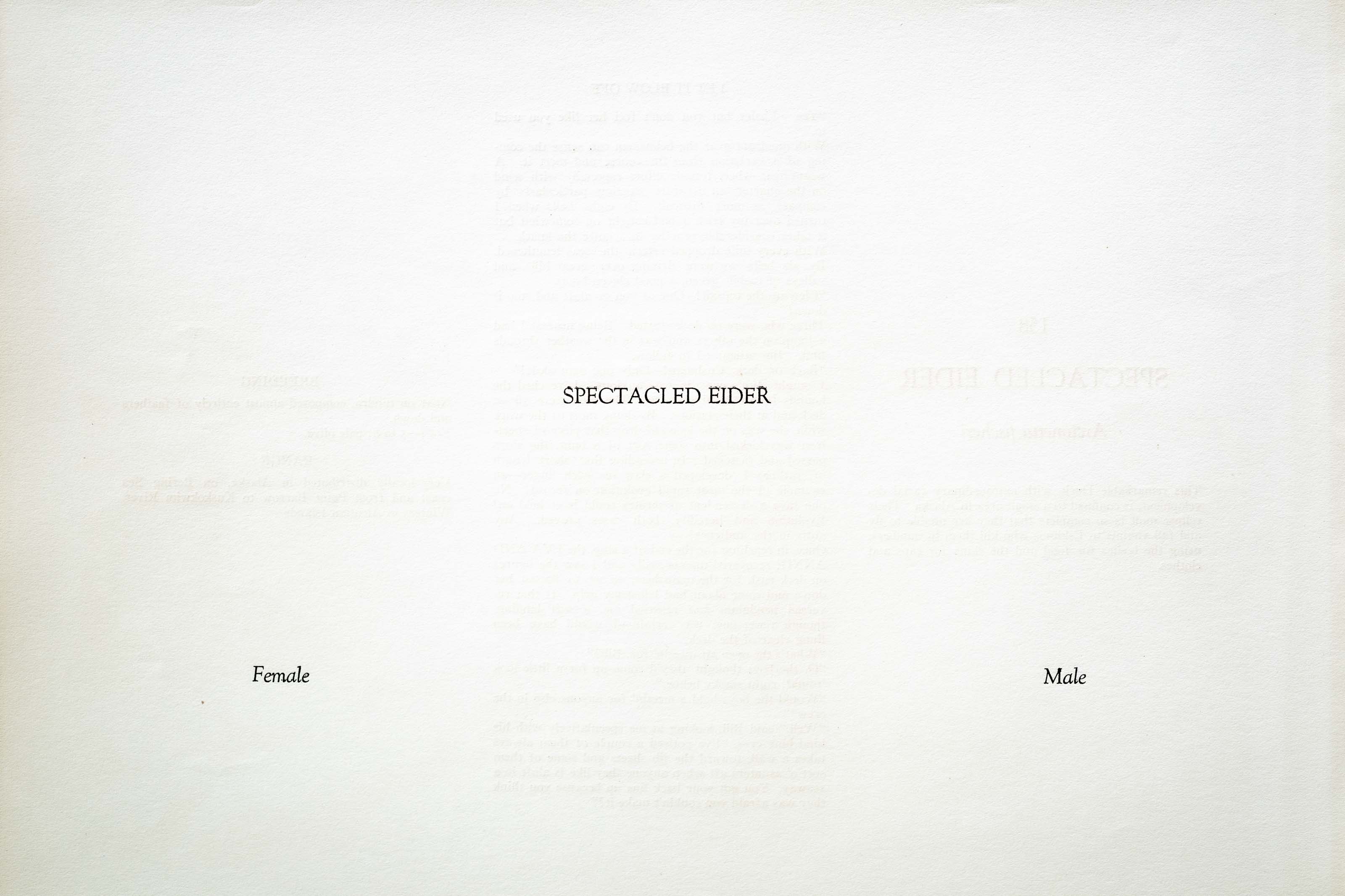 This remarkable Duck, with extraordinary facial development, is confined to a small area in Alaska. Their eclipse molt is so complete that they are unable to fly and fall victims to Eskimos who kill them in numbers, using the bodies for food and the skins for caps and clothes.