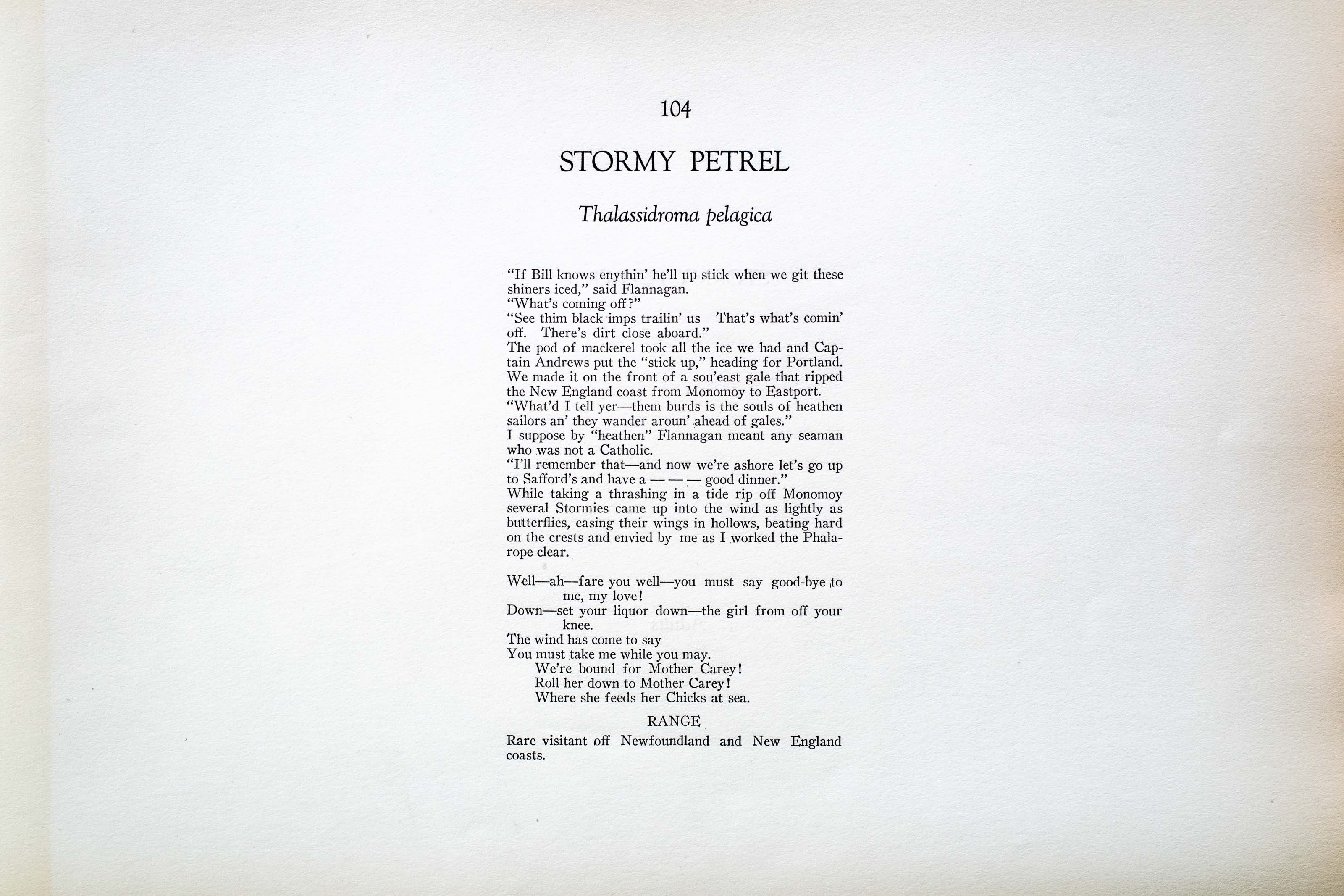 While taking a thrashing in a tide rip off Monomoy several Stormies came up into the wind as lightly as butterflies, easing their wings in hollows, beating hard on the crests and envied by me as I worked the Phalarope clear.