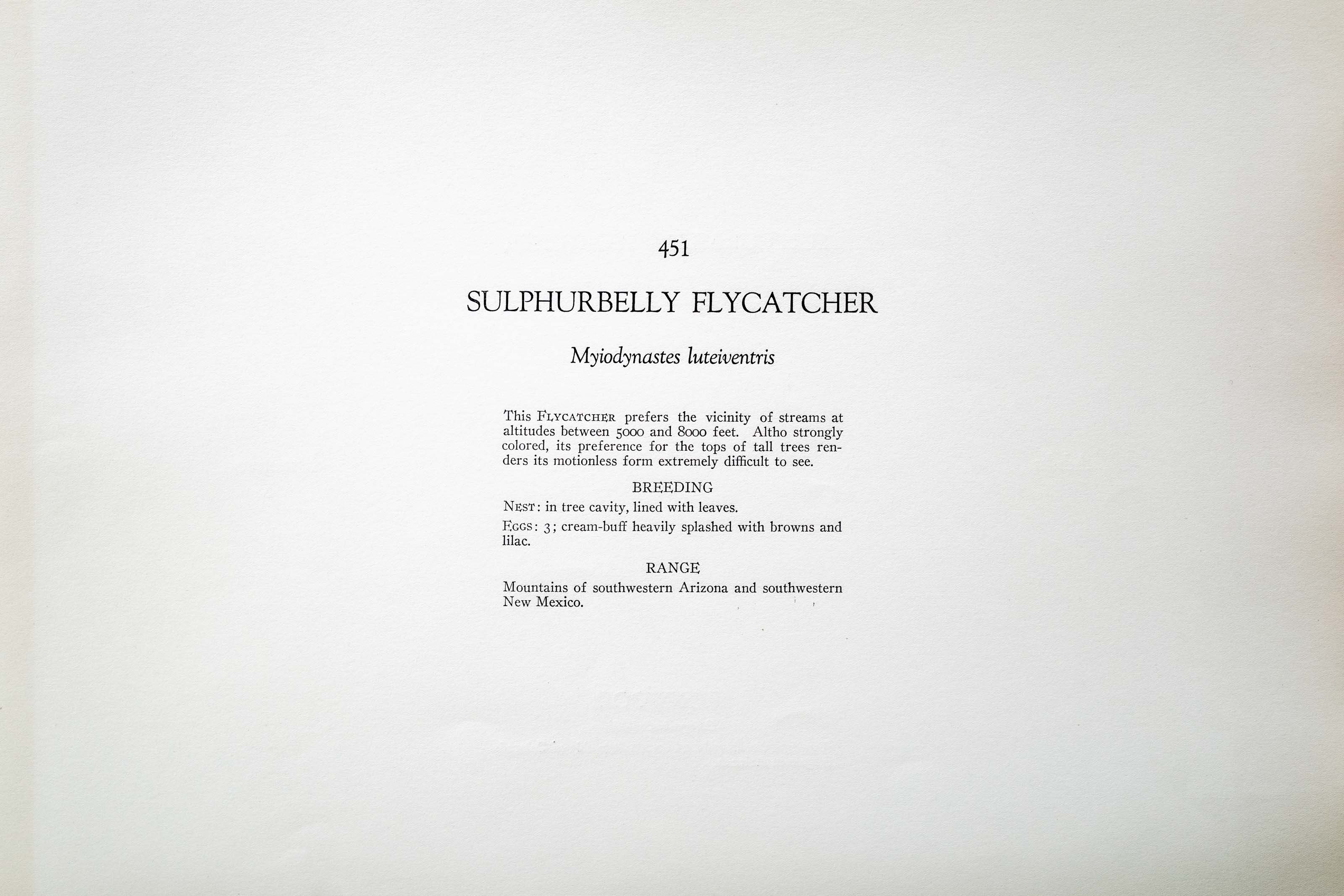 This FLYCATCHER prefers the vicinity of streams at altitudes between 5000 and 8000 feet. Altho strongly colored, its preference for the tops of tall trees renders its motionless form extremely difficult to see.