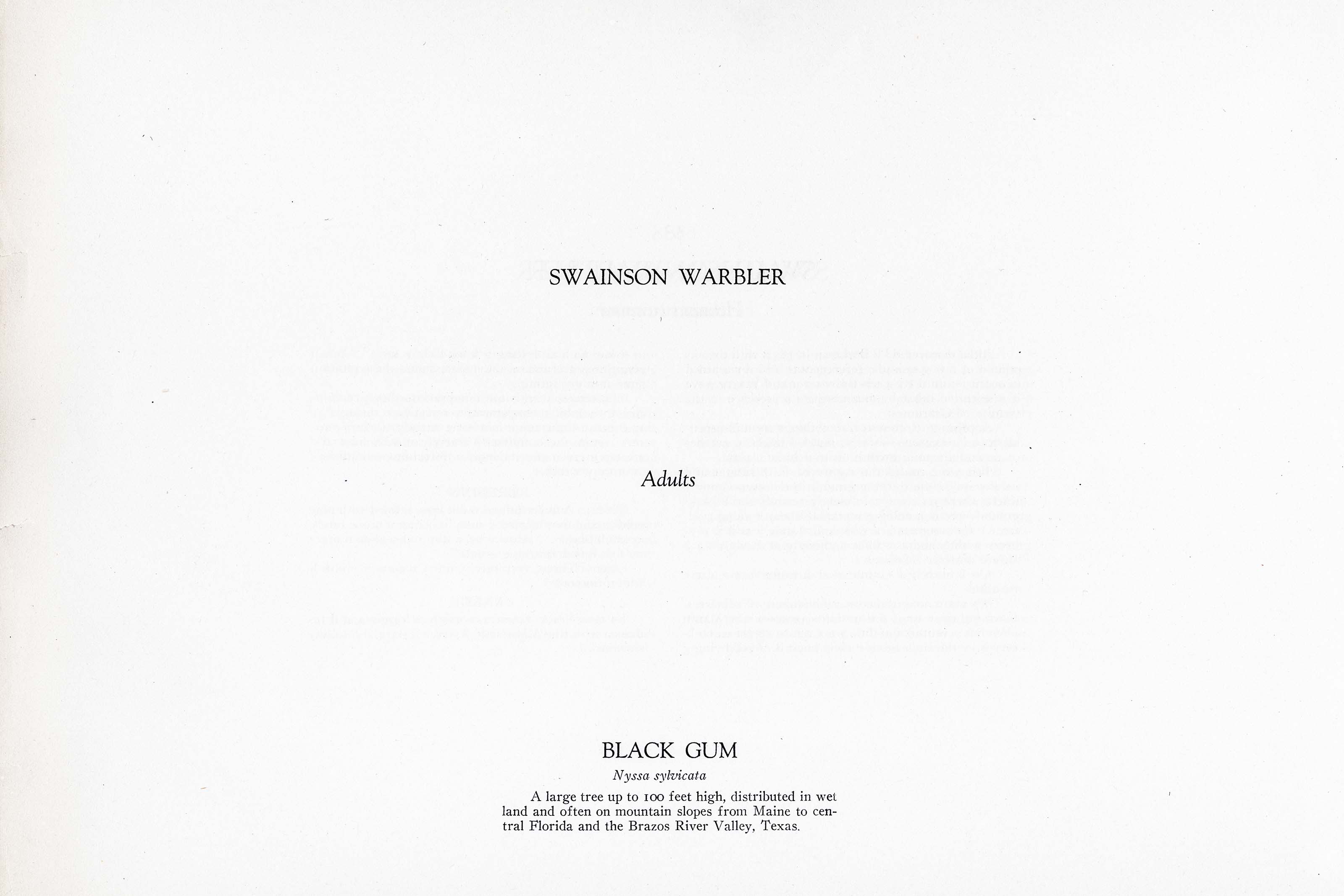 They are among the most individual of Warblers, following their way of life in dim recesses where Man seldom has ventured and they are apt to surprise an observer by suddenly leaving their pursuit of food, flying to a low limb and voicing a loud clear song. When giving this performance, the male assumes the position figured in my painting.