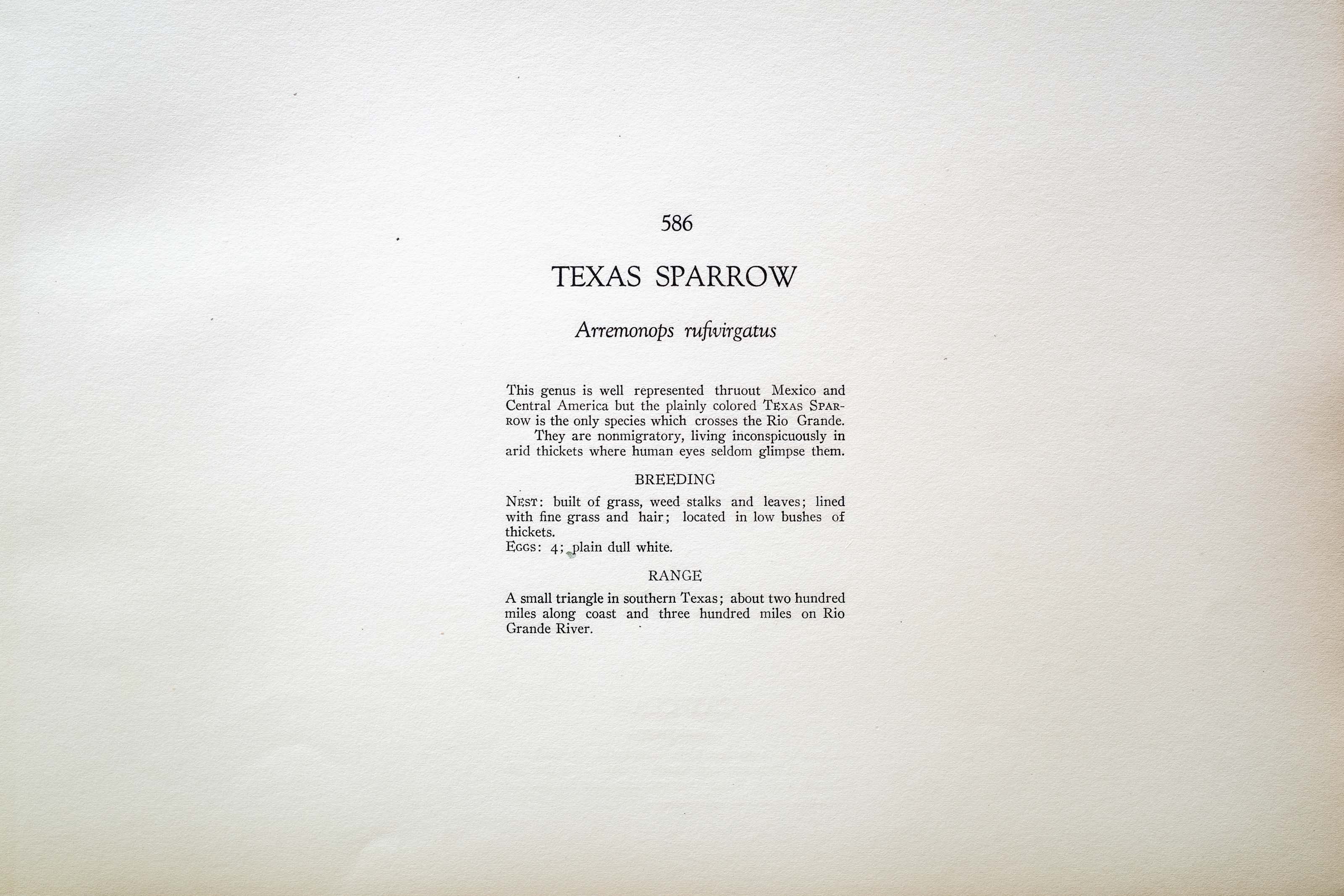 This genus is well represented thruout Mexico and Central America but the plainly colored TEXAS SPARROW is the only species which crosses the Rio Grande.