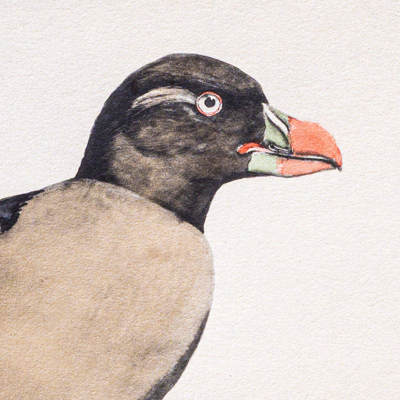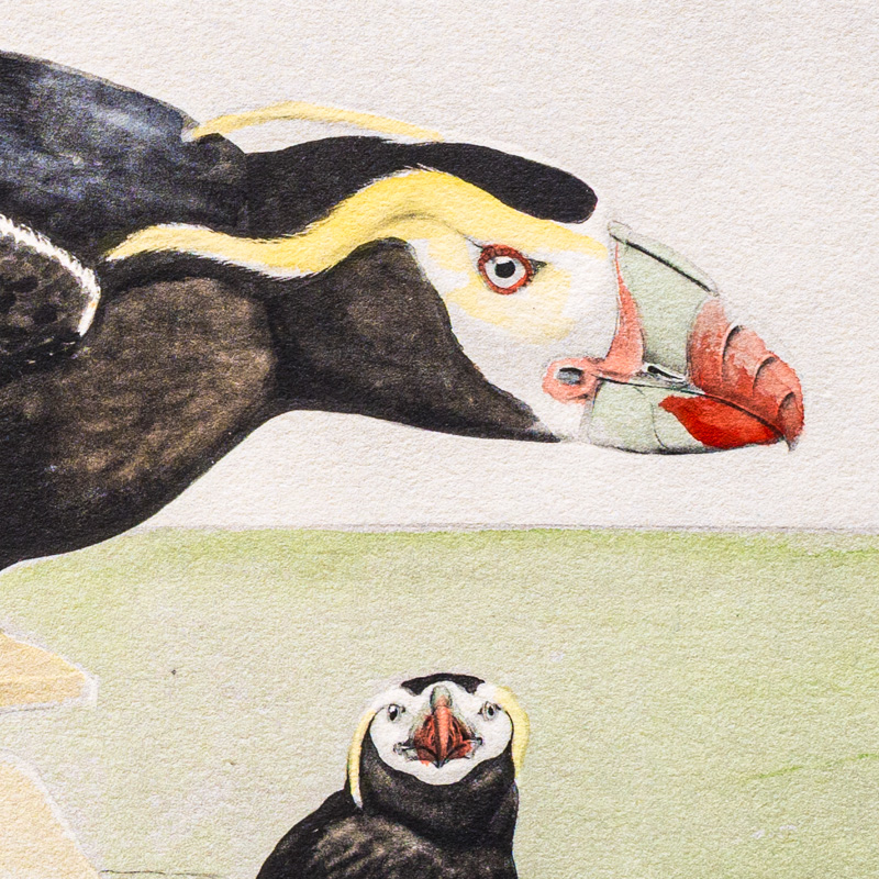 Mr. Punch of Birdland is an apt nickname for this bird in Spring plumage. With flowing head plumes, grotesque bill and vermilion feet, they seem like apparitions from some strange world. The extraordinary bill is built up of 18 plates, 16 of which are shed after the breeding season. This is an effective weapon and few enemies attack the bird guarding its home.
