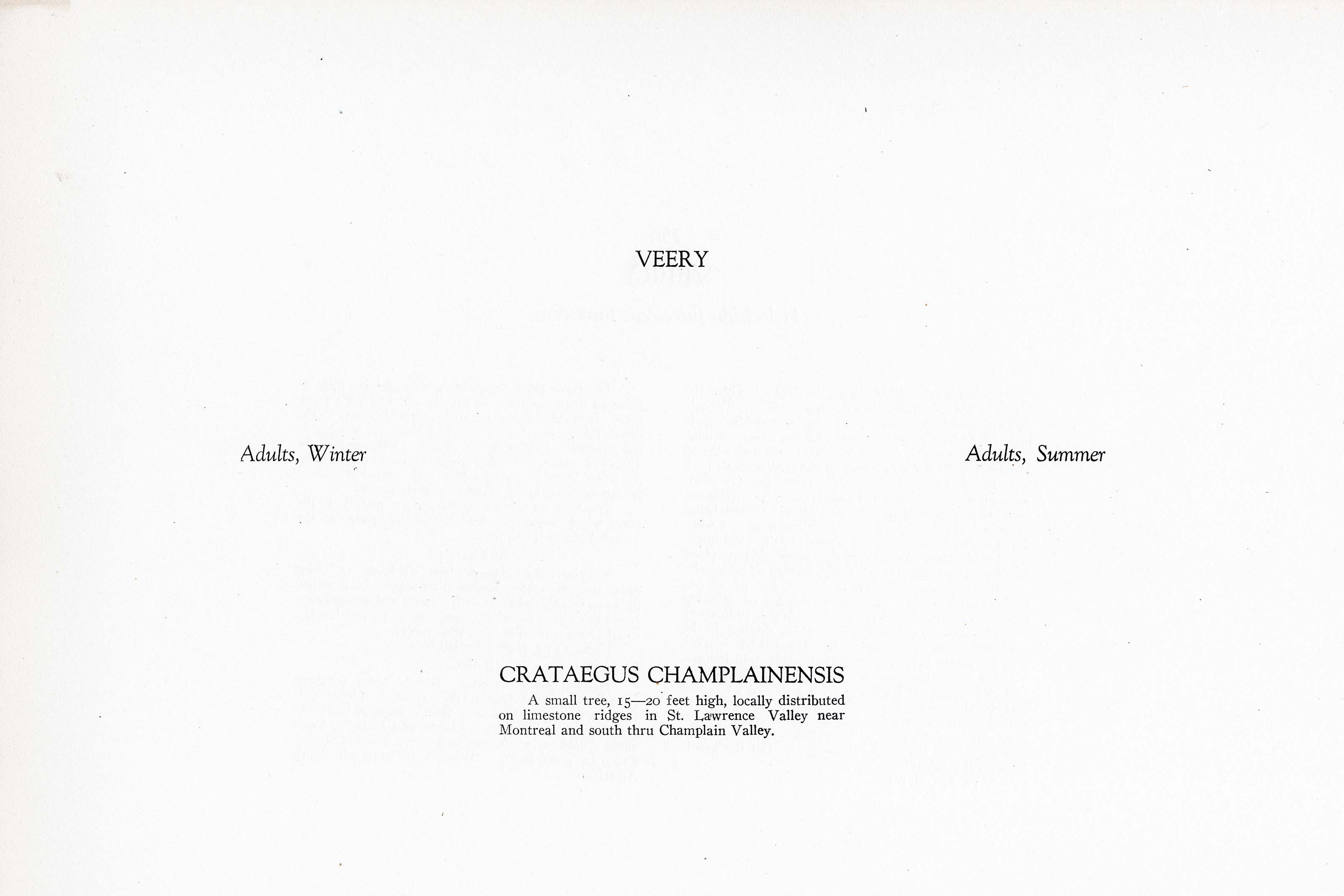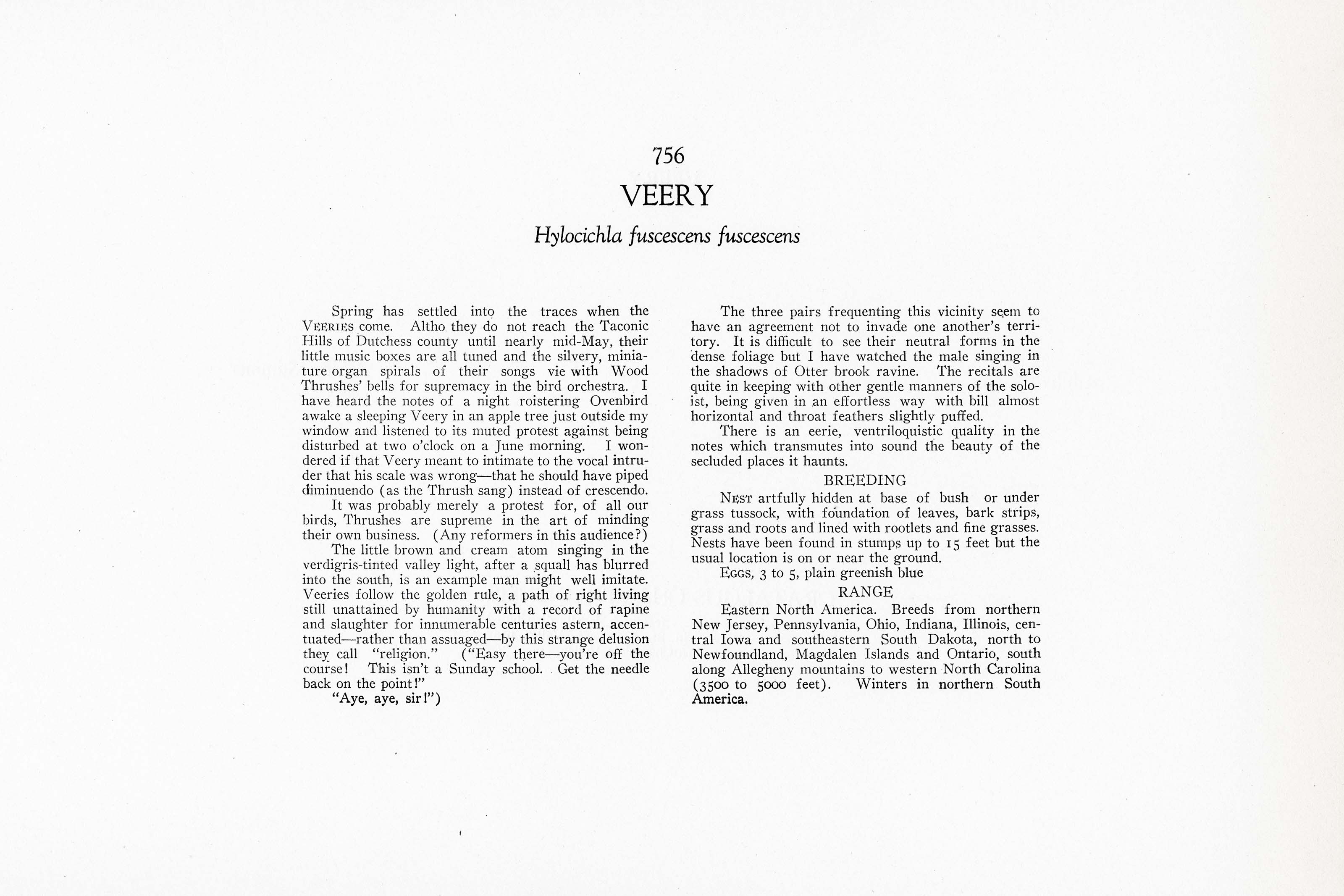 Spring has settled into the traces when the VEERIES come. Altho they do not reach the Taconic Hills of Dutchess county until nearly mid-May, their little music boxes are all tuned and the silvery, miniature organ spirals of their songs vie with Wood Thrushes' bells for supremacy in the bird orchestra. I have heard the notes of a night roistering Ovenbird awake a sleeping Veery in an apple tree just outside my window and listened to its muted protest against being disturbed at two o'clock on a June morning. I wondered if that Veery meant to intimate to the vocal intruder that his scale was wrong — that he should have piped diminuendo (as the Thrush sang) instead of crescendo.