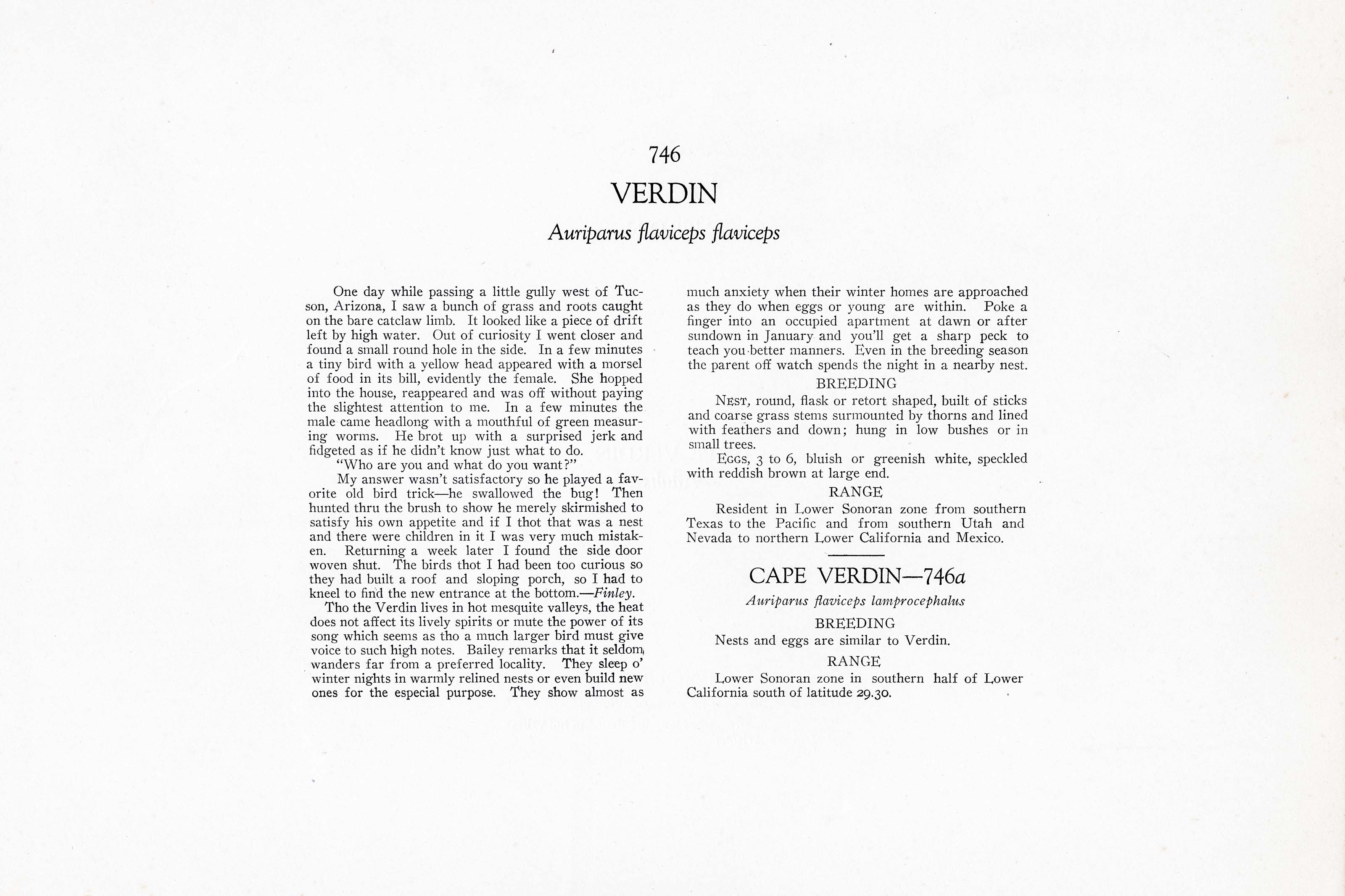One day while passing a little gully west of Tucson, Arizona, I saw a bunch of grass and roots caught on the bare catclaw limb. It looked like a piece of drift left by high water. Out of curiosity I went closer and found a small round hole in the side. In a few minutes a tiny bird with a yellow head appeared with a morsel of food in its bill, evidently the female. She hopped into the house, reappeared and was off without paying the slightest attention to me. In a few minutes the male came headlong with a mouthful of green measuring worms. He brot up with a surprised jerk and fidgeted as if he didn't know just what to do.