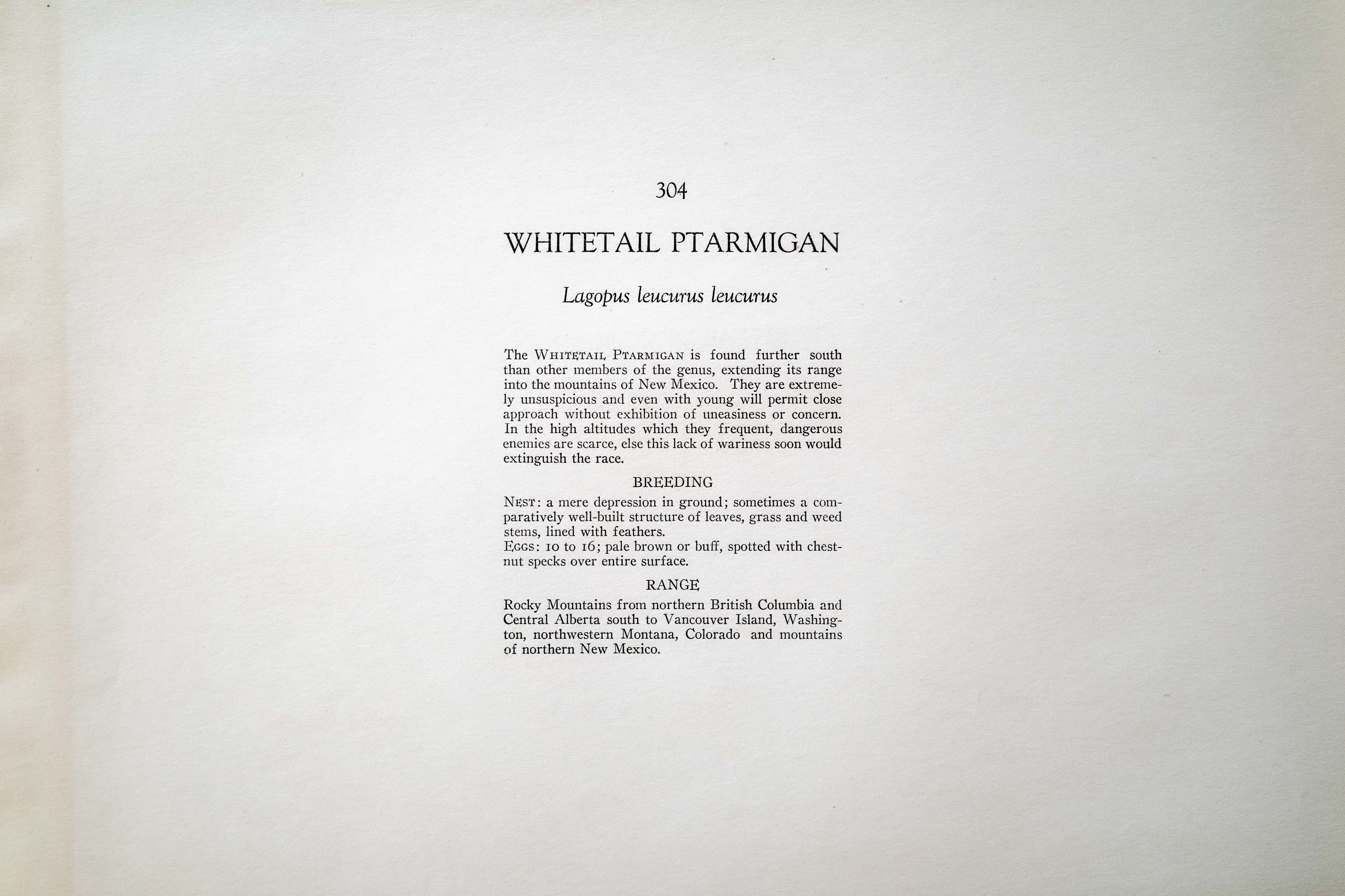 The WHITETAIL PTARMIGAN is found further south than other members of the genus, extending its range into the mountains of New Mexico. They are extremely unsuspicious and even with young will permit close approach without exhibition of uneasiness or concern. In the high altitudes which they frequent, dangerous enemies are scarce, else this lack of wariness soon would extinguish the race.