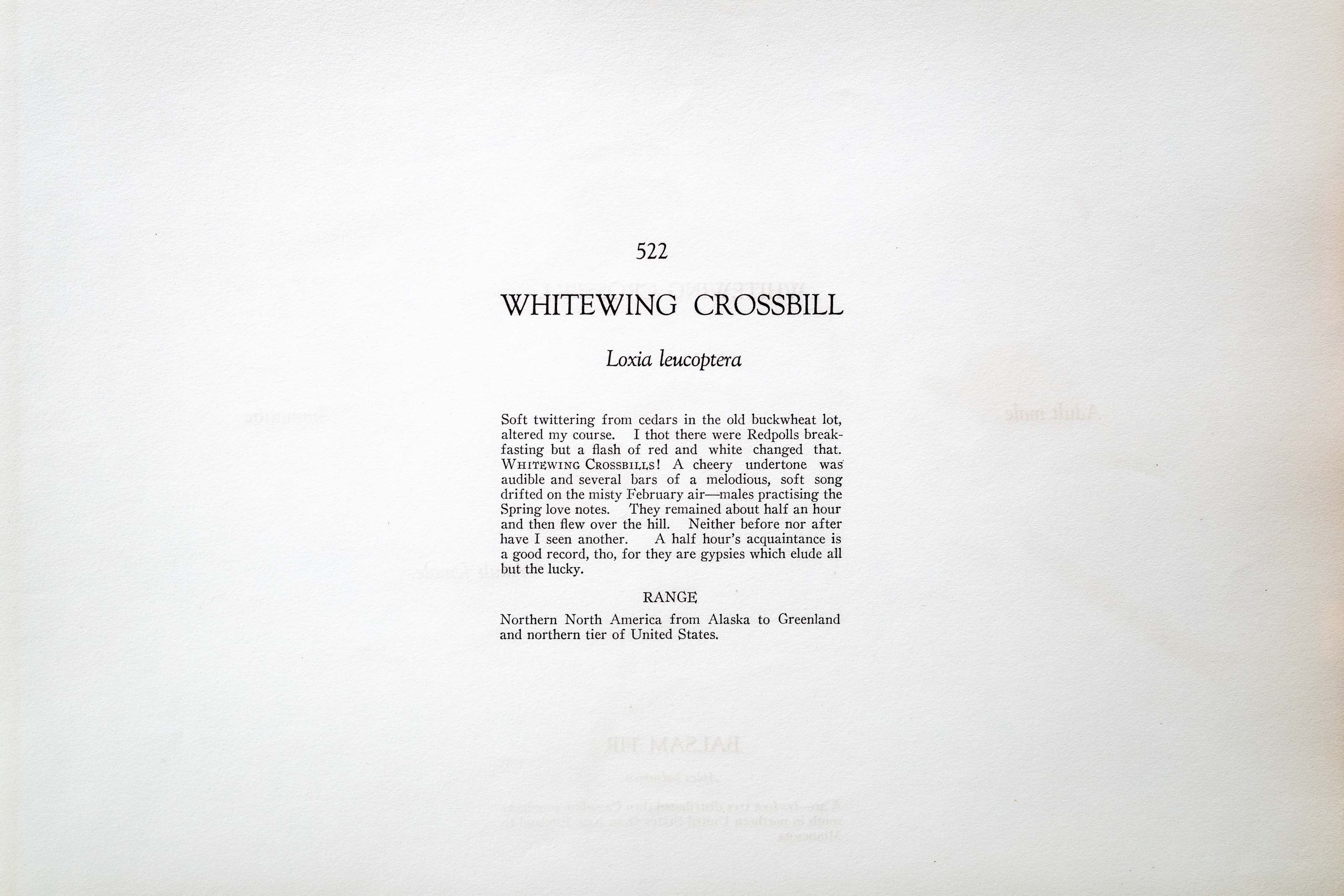 Soft twittering from cedars in the old buckwheat lot, altered my course. I thot there were Redpolls breakfasting but a flash of red and white changed that. WHITEWING CROSSBILLS! A cheery undertone was audible and several bars of a melodious, soft song drifted on the misty February air — males practising the Spring love notes. They remained about half an hour and then flew over the hill. Neither before nor after have I seen another. A half hour's acquaintance is a good record, tho, for they are gypsies which elude all but the lucky.