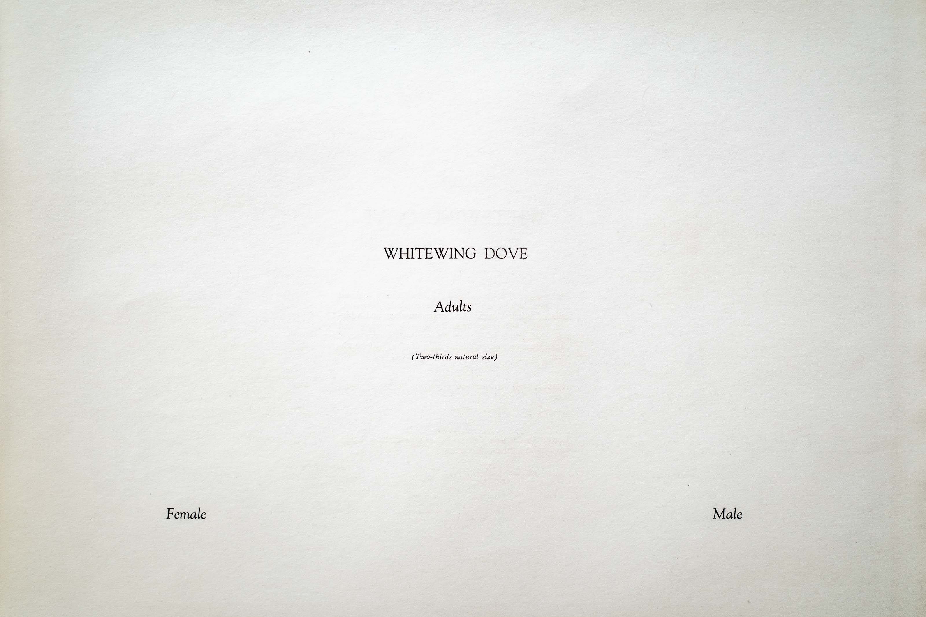 Finley states that the notes of this fine bird are bold and emphatic, lacking entirely the characteristic melancholy calls of other Doves. Its notes, numbers and whirring flight, with conspicuous white bands on wings and tail, make it one of the best known birds of the torrid cactus deserts and mesquite vallies of the arid southwest.