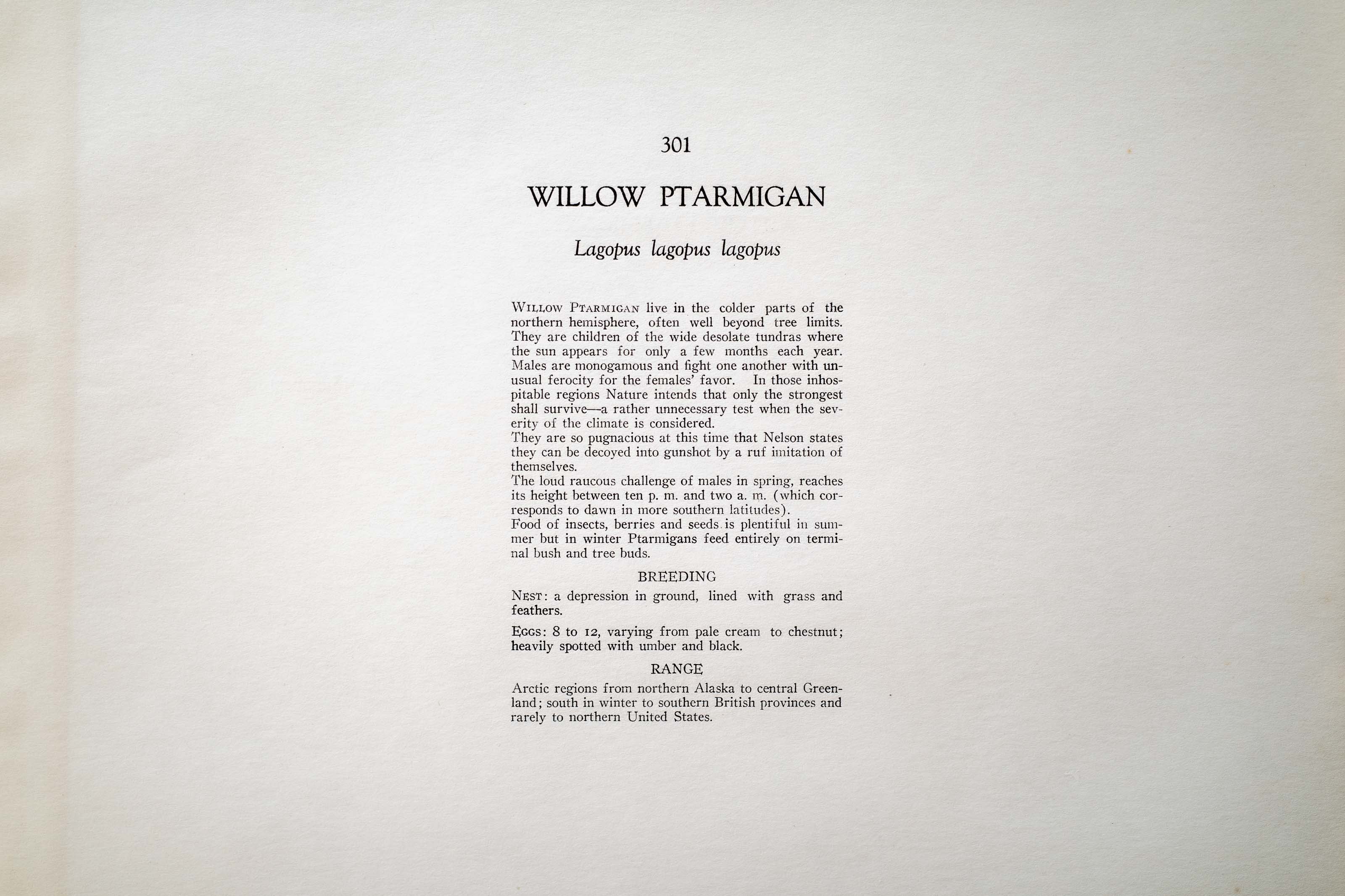 WILLOW PTARMIGAN live in the colder parts of the northern hemisphere, often well beyond tree limits. They are children of the wide desolate tundras where the sun appears for only a few months each year. Males are monogamous and fight one another with unusual ferocity for the females' favor. In those inhospitable regions Nature intends that only the strongest shall survive — a rather unnecessary test when the severity of the climate is considered.