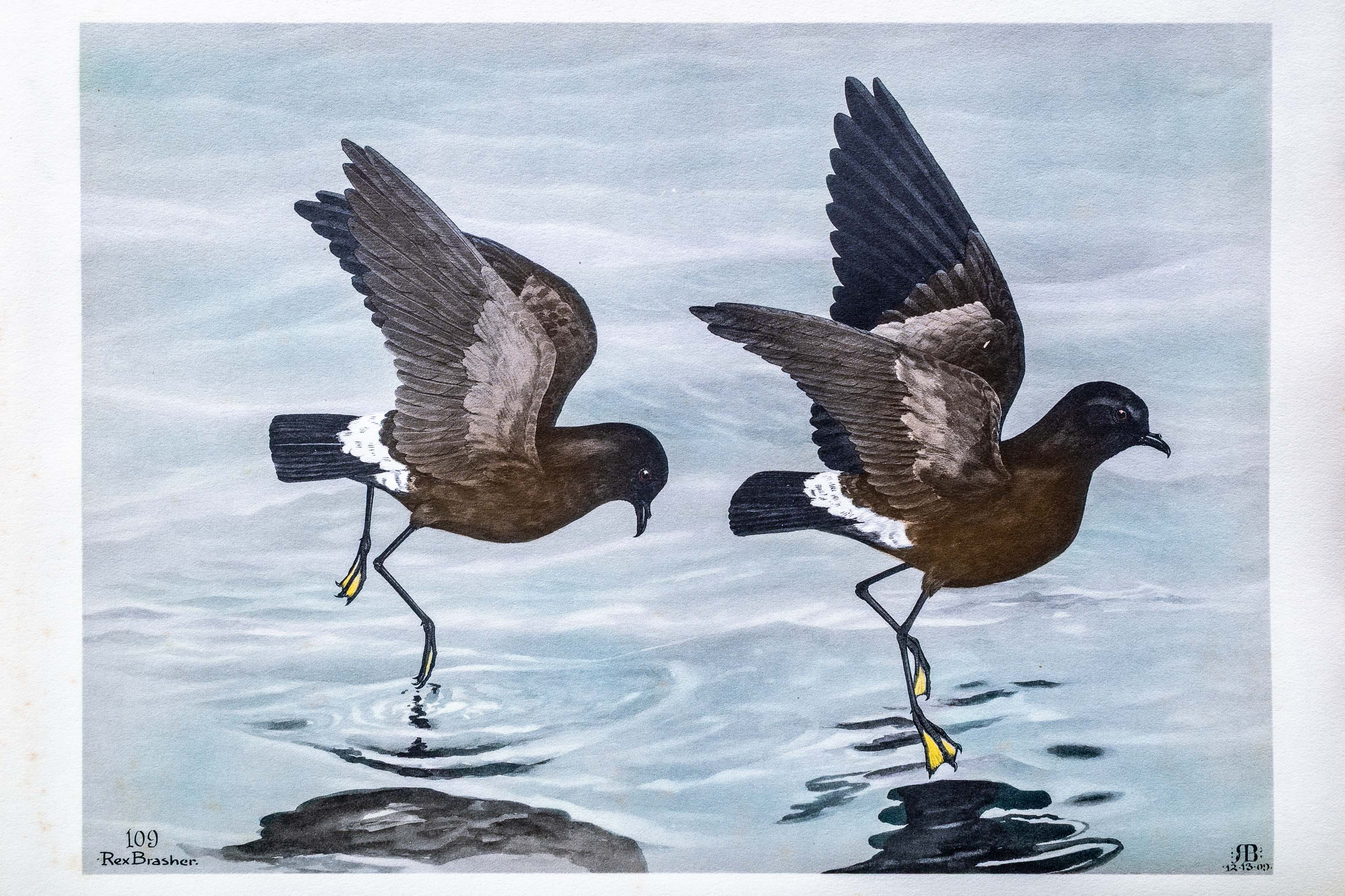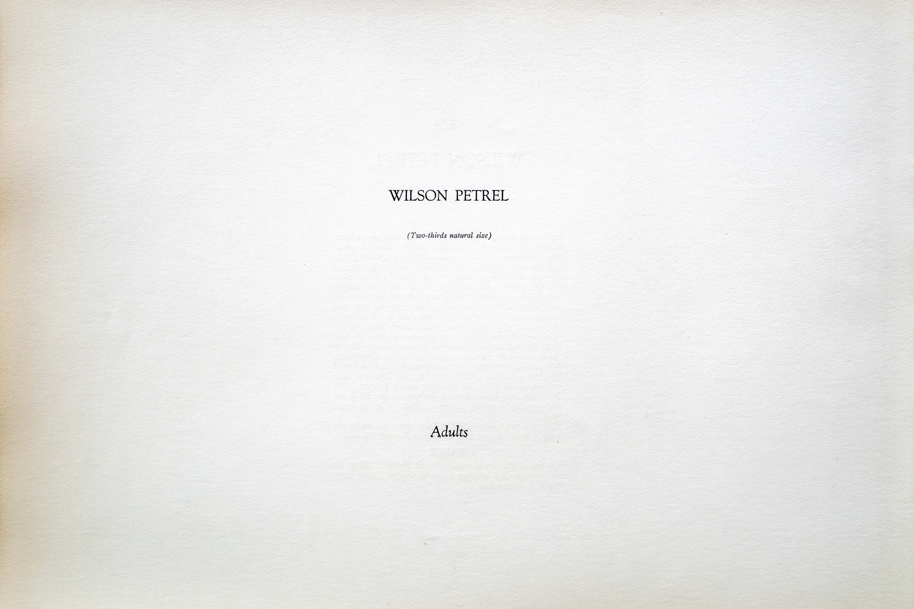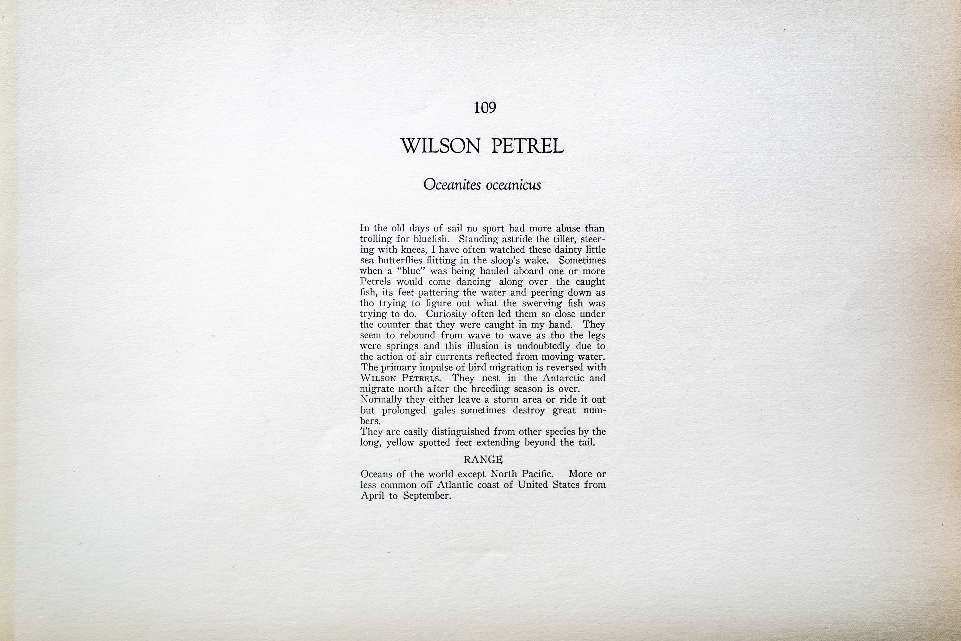 In the old days of sail no sport had more abuse than trolling for bluefish. Standing astride the tiller, steering with knees, I have often watched these dainty little sea butterflies flitting in the sloop's wake. Sometimes when a "blue" was being hauled aboard one or more Petrels would come dancing along over the caught fish, its feet pattering the water and peering down as tho trying to figure out what the swerving fish was trying to do. Curiosity often led them so close under the counter that they were caught in my hand. They seem to rebound from wave to wave as tho the legs were springs and this illusion is undoubtedly due to the action of air currents reflected from moving water. The primary impulse of bird migration is reversed with WILSON PETRELS. They nest in the Antarctic and migrate north after the breeding season is over.