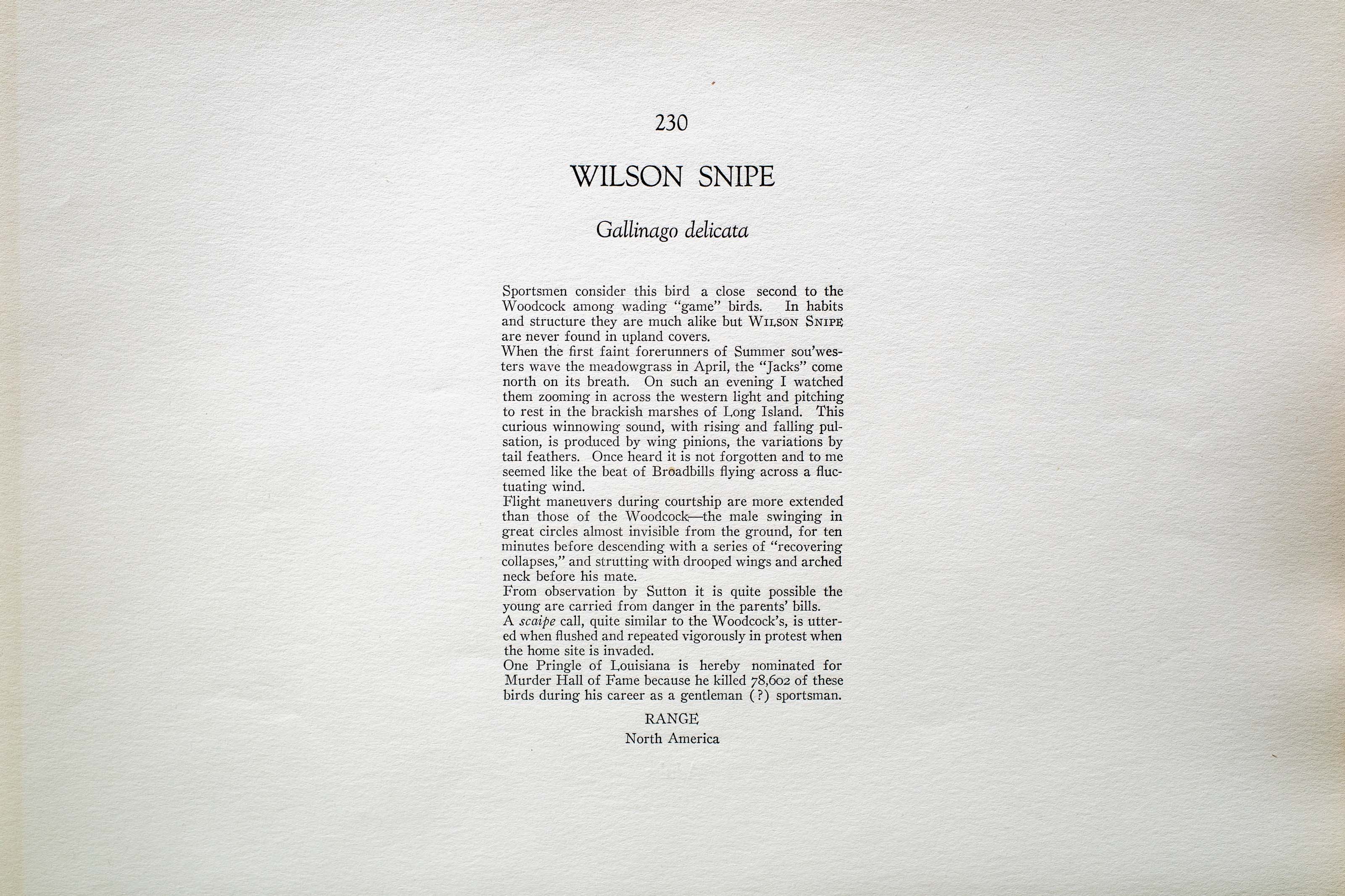 Sportsmen consider this bird a close second to the Woodcock among wading "game" birds. In habits and structure they are much alike but WILSON SNIPE are never found in upland covers.