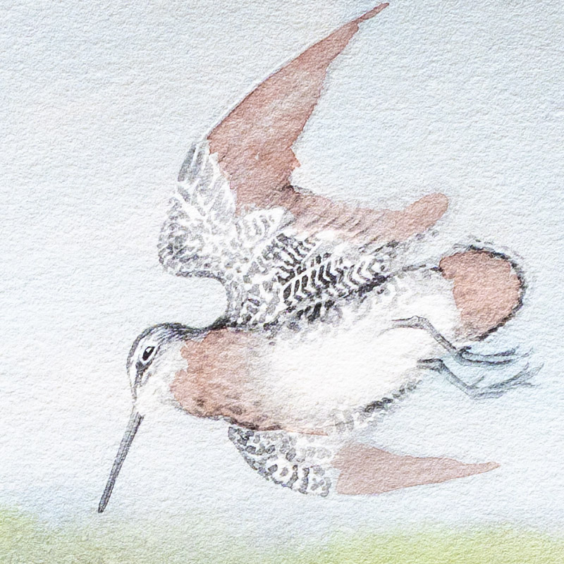 Flight maneuvers during courtship are more extended than those of the Woodcock — the male swinging in great circles almost invisible from the ground, for ten minutes before descending with a series of "recovering collapses," and strutting with drooped wings and arched neck before his mate.