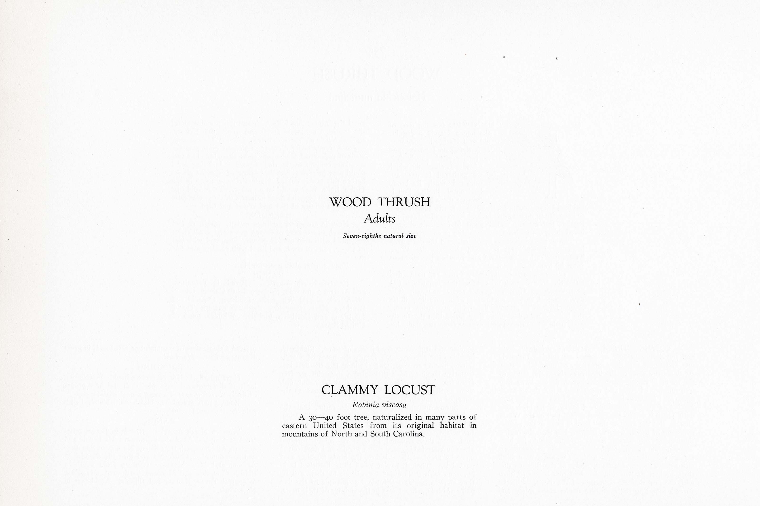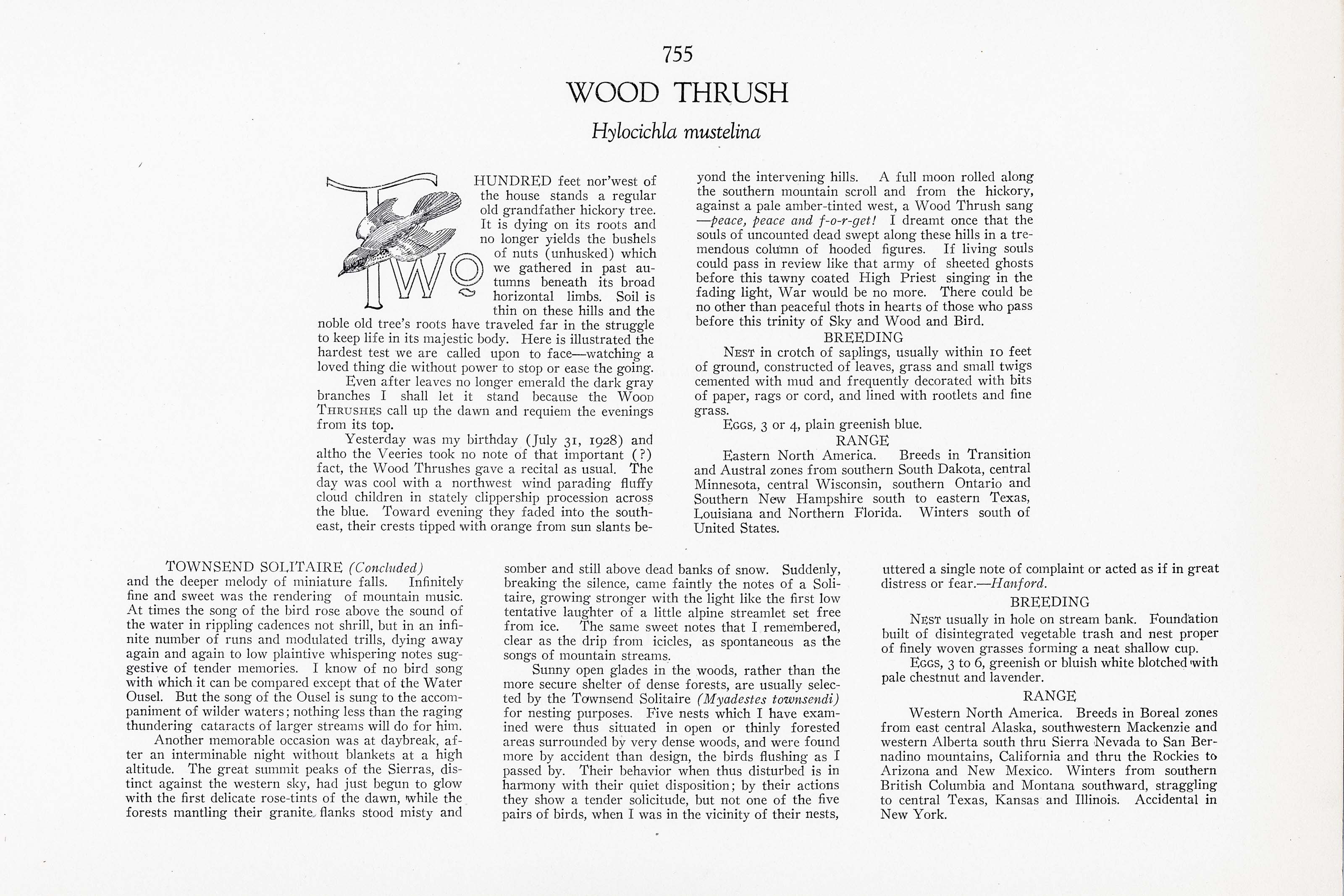 Yesterday was my birthday (July 31, 1928) and altho the Veeries took no note of that important (?) fact, the Wood Thrushes gave a recital as usual. The day was cool with a northwest wind parading fluffy cloud children in stately clippership procession across the blue. Toward evening they faded into the southeast, their crests tipped with orange from sun slants beyond the intervening hills. A full moon rolled along the southern mountain scroll and from the hickory, against a pale amber-tinted west, a Wood Thrush sang — peace, peace and f-o-r-get! I dreamt once that the souls of uncounted dead swept along these hills in a tremendous column of hooded figures. If living souls could pass in review like that army of sheeted ghosts before this tawny coated High Priest singing in the fading light, War would be no more. There could be no other than peaceful thots in hearts of those who pass before this trinity of Sky and Wood and Bird.